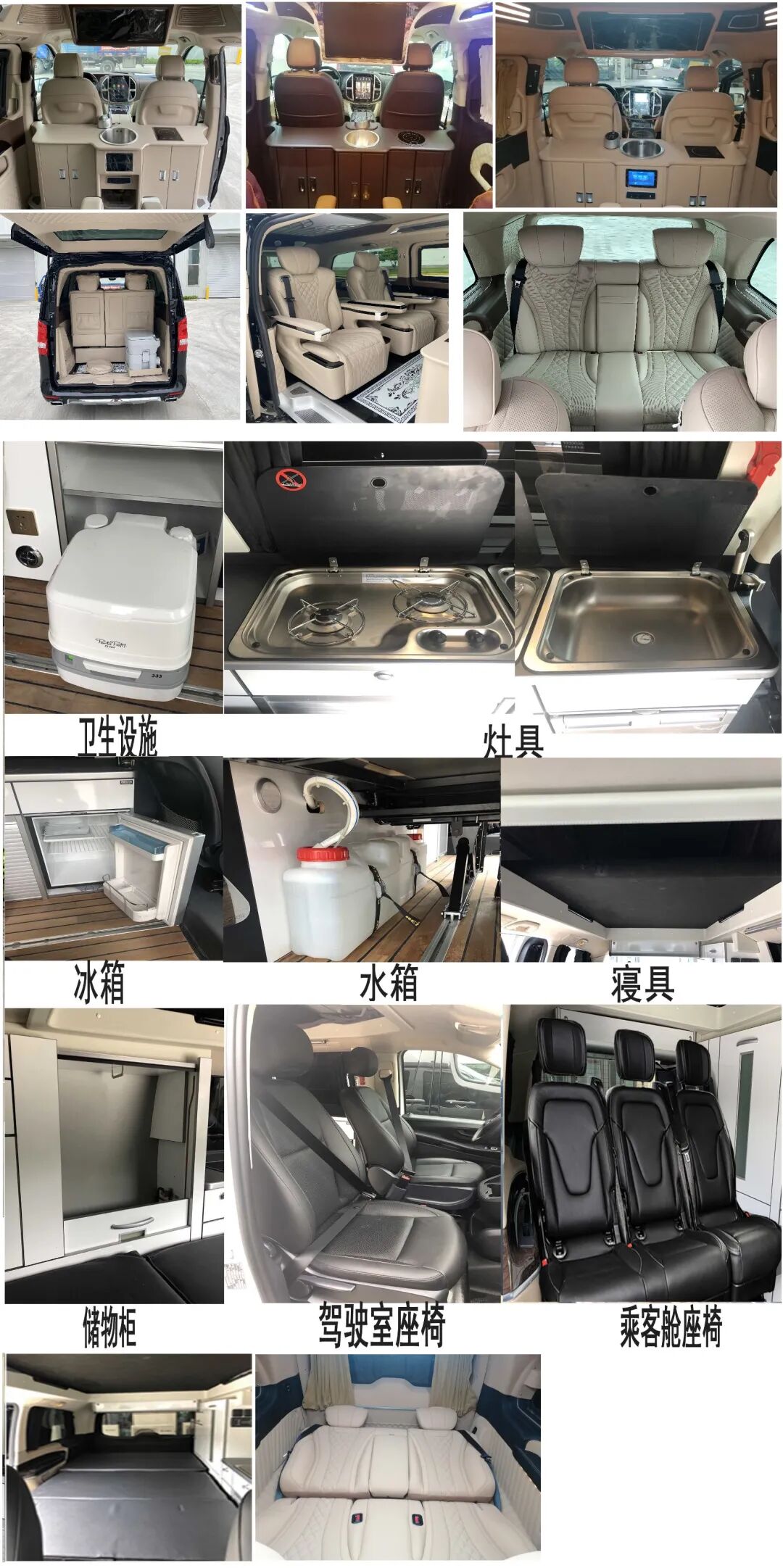 1.该车配备冰箱,厨具,座椅,卧具,卫生设施等旅居生活设施和娱乐设施等专用装置;2.车厢顶部封闭不可开启;3.车顶选装太阳能电池;2.该车非乘用车,行驶过程中不载人。