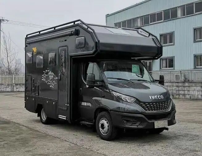 本车顶部封闭,不可开启.厢体内安装有床铺,桌柜,厨具,卫生设施等专用设备,用于旅居宿营.该车为非乘用车,行驶过程中不载人;根据内部布局不同,车辆顶部可选装不同型式太阳能板、换气扇、天窗、卫星天线、空调;车辆右侧可选装不同型式不同位置的侧舱门、乘客门、侧窗。