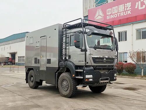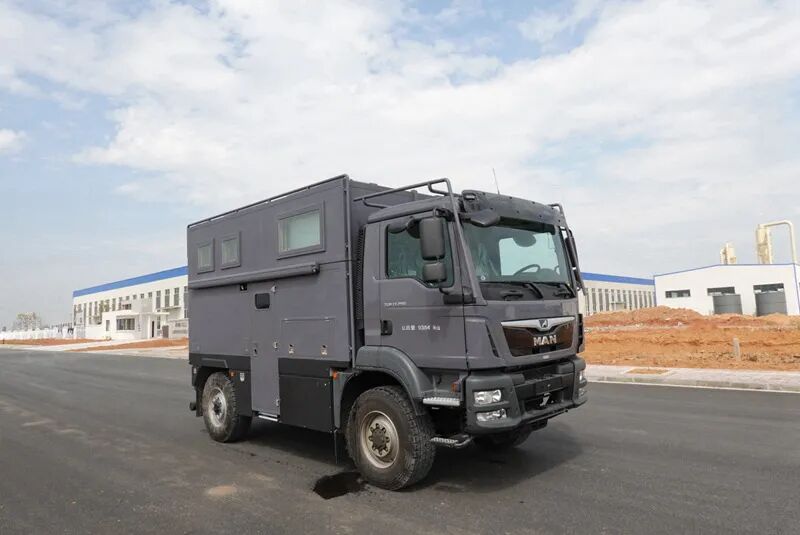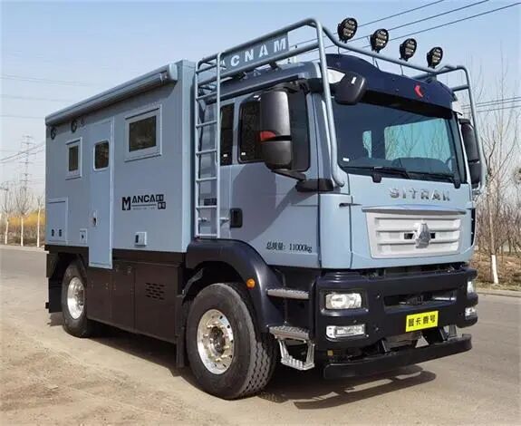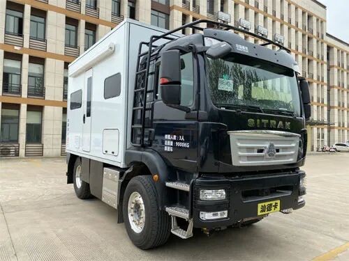 车头灯具为选装,供人员在野外非道路状况下工作和生活照明使用,配备厨具,卧具,卫生设施等旅居生活设施和娱乐设施等专用装置;可随车携带必备物品,骑行装备等。车厢两侧均可开散热格栅和仪器舱门, 侧防护为裙板结构,材质为超高强度铝合金。