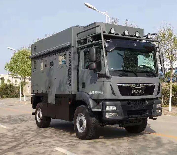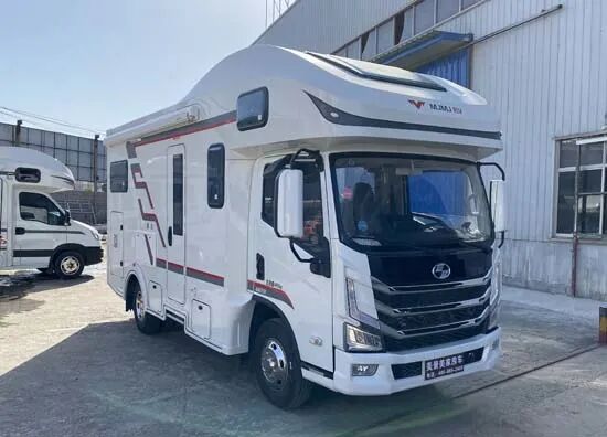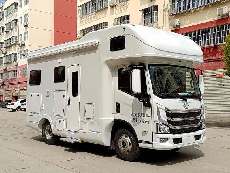 该车装配睡具,炊具,卫生设施等设备,用于旅行宿营.仅选用驾驶室后围有贯通开口的底盘改装。车辆侧、后防护均采用裙边结构。随底盘选装前部灯具,驾驶室前围格栅,该底盘允许牵引挂车,其准拖挂车总质量为3500kg。