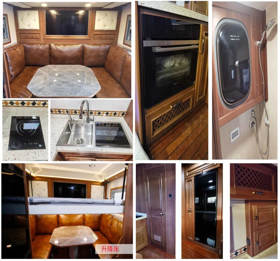 1、该车配备照明、睡具、桌椅、厨具、卫生等生活和娱乐设施;2、选装顶置空调,排气风扇,太阳能电池;选装两侧外形,后部外形,后围灯具,车身开门,额头造型,选装左、后拓展仓,选装沙发转换卧具;选装遮阳篷,选装蓄电池及驻车空调;