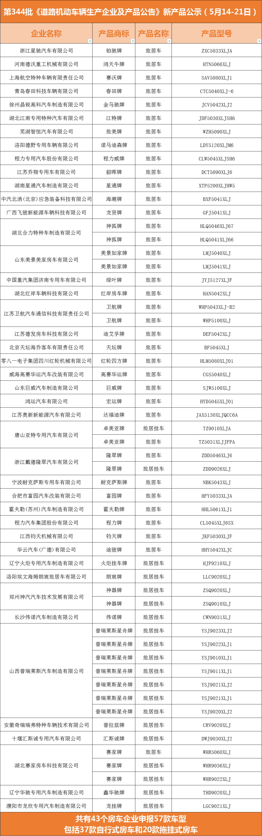 2021年5月14日,国家工业和信息化部在官方网站公示了第344批《道路机动车辆生产企业及产品公告》(以下简称《公告》)新产品。其中共有43家房车企业申报57款车型,包括37款自行式房车和20款拖挂式房车,小编将具体的名单整理列出了表格,想要了解更多的小伙伴们可以去官网了解详情哦!