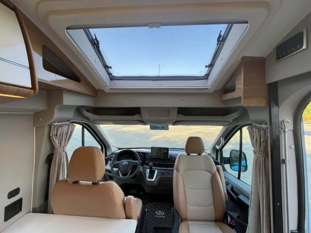 无中门设计,车内空间利用高效,额头处增加了一个超大天窗,提升了整车内部采光和通风;后置大横床宽敞通透,尺寸为1850X1200mm,满足日常睡眠休息所需。