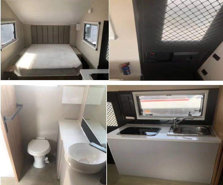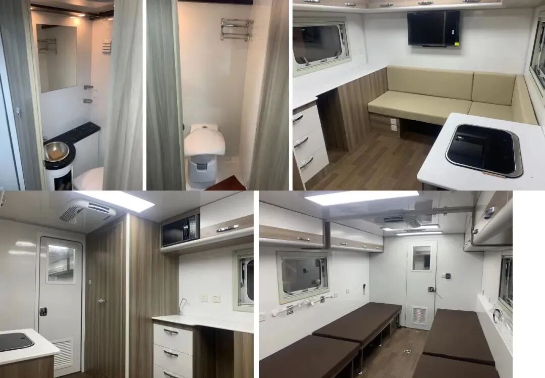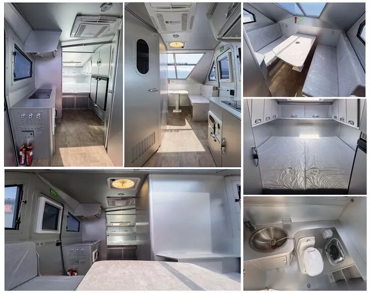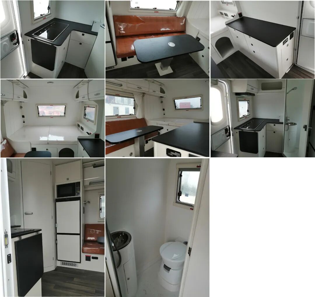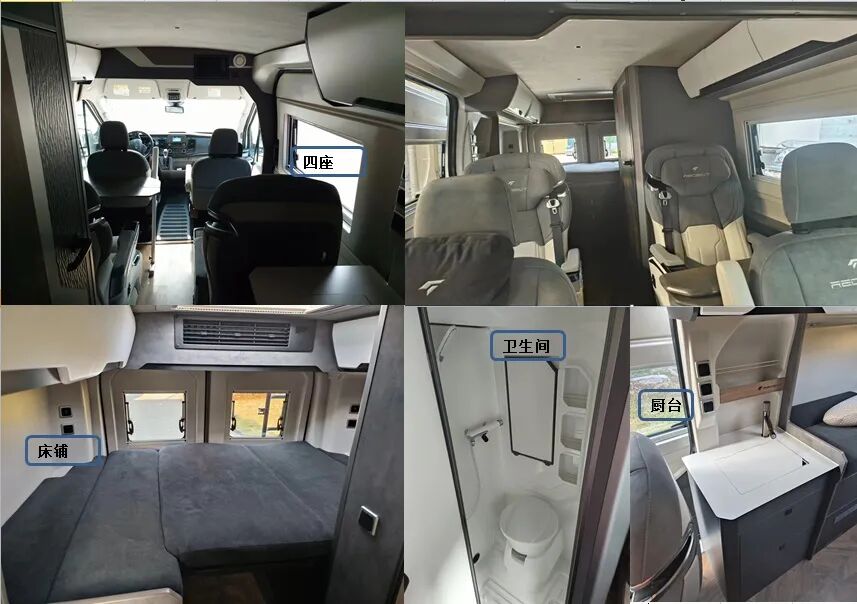 1.车厢顶部封闭不可开启,牵引杆深入量为50mm,连接器最大负荷100kg;2.该车非乘用车,行驶过程中不载人;3.厢体内安装有床铺,桌柜,卫生设施和炊具设施等旅居专用设备;4.选装内部布局。