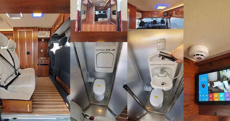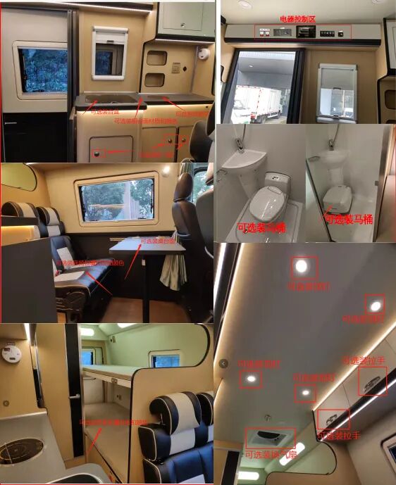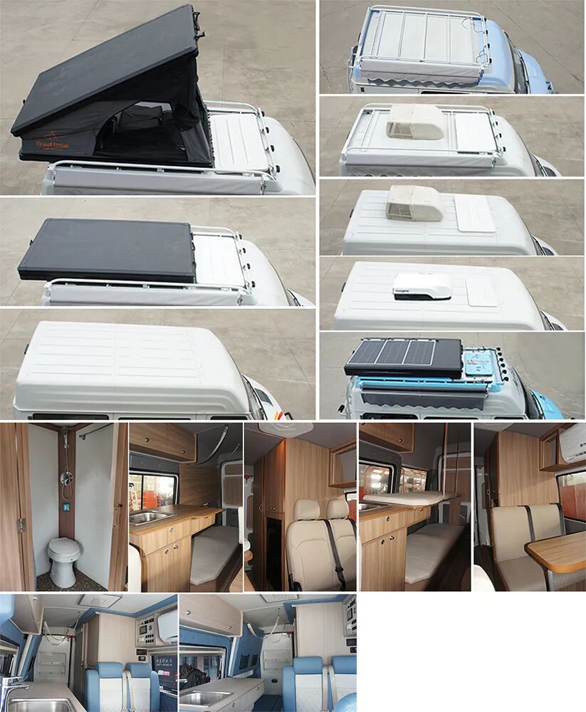 1.该车配备有桌椅、炊事设施、床、卫生设施及必要的照明和空气调节等旅居生活设施,座椅可转换成卧具,顶部为升降顶结构,车辆在行驶过程中顶部不得进行开启或升降操作; 2.选装车厢高度,高车厢:顶部无换气扇、无天窗、车顶选装太阳能电池板和不装太阳能电池板时整车高度均为2225mm,选装车顶卫浴换气扇时整车高度为2280mm。