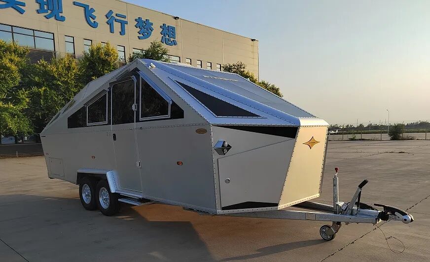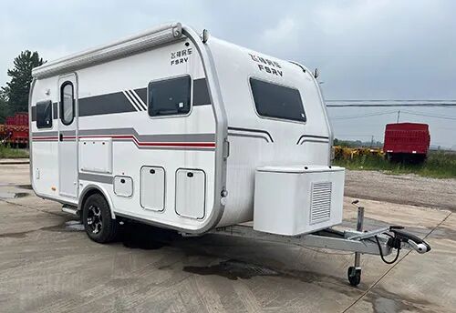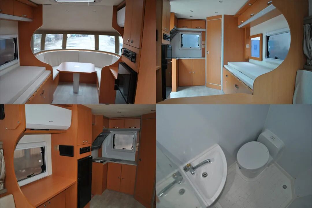 车厢顶部封闭,不可开启,该车非乘用车,行驶过程中不可载人.车厢内部安装睡具,厨具,卫生间,电视机等多种旅居专用设备.车右侧装遮阳棚时整车宽度2285mm,牵引杆深入量35mm.连接器最大负荷100kg。