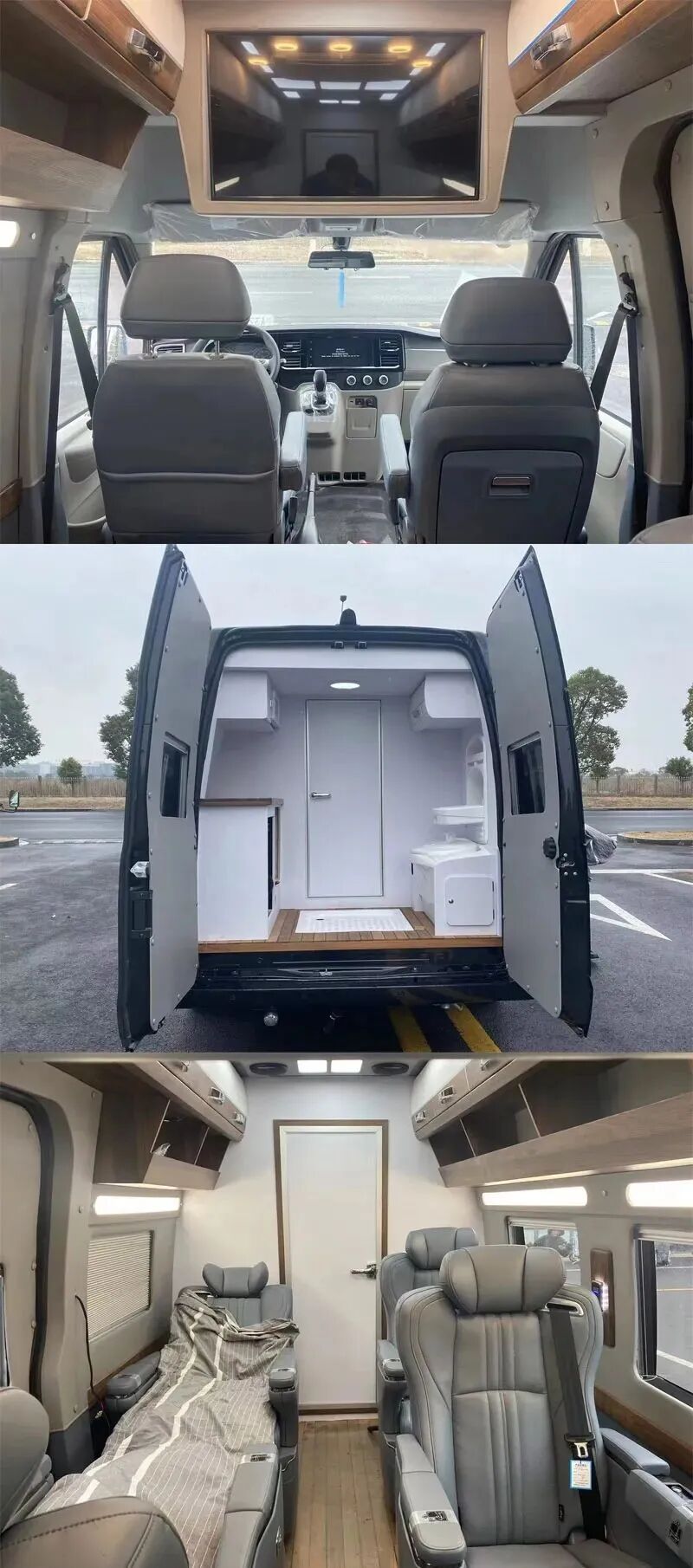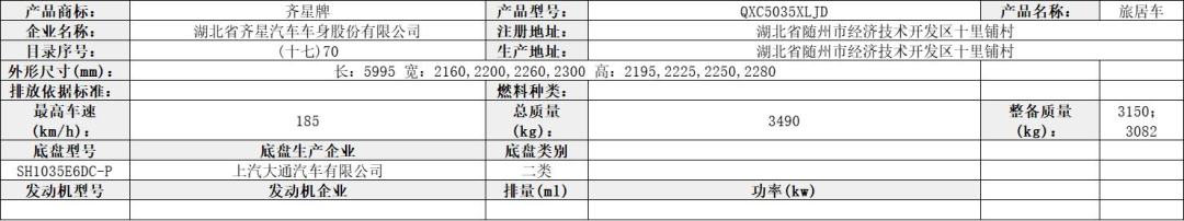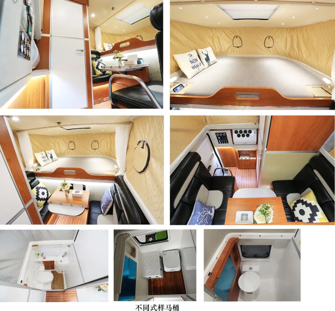该车装配睡具、卫生设施,报警装置等旅居生活设施;车辆顶部可升起(行驶时顶部收起);底盘选装不同式样前照灯、前格栅、装饰件、前保险杠、轮眉、轮辋、卡钳;随底盘选装前泊车影像、侧踏板;选装不同式样马桶;选装后挡玻璃、太阳能板、柴油灶,直接供电式ETC;选装轻质高端内饰(外形不变)对应的整备质量(kg)为:2110。