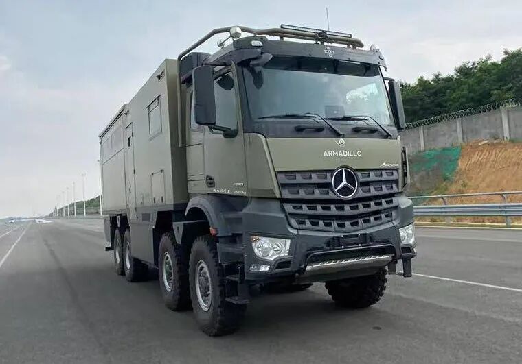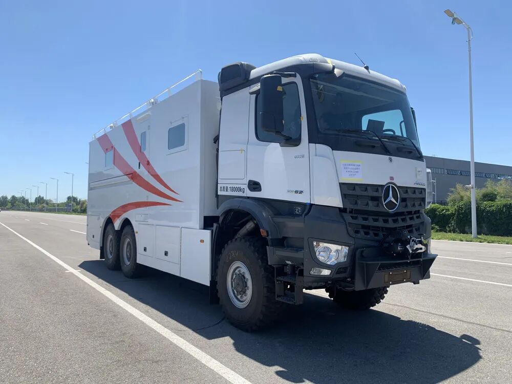 1.发动机最大净功率425kW。2.侧防护为裙板结构,材质为高强度铝合金,离地高度为545(mm),后防护为Q355B钢,截面尺寸:120X60(高X宽,单位:mm),离地高度为:490(mm),连接方式为:螺接。3.ABS系统控制方式:4通道;ABS系统控制器型号:EBS4+;ABS系统控制器生产企业:WABCO。4.车厢内部配备桌椅、床、厨具、洗菜洗脸池、马桶、淋浴、空调等生活设施。