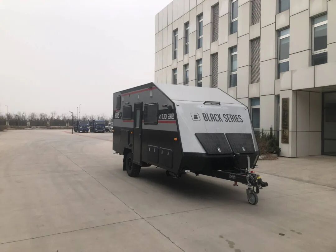 该车侧面和后部结构为裙边结构,后部结构离地高度为365mm.选装顶置空调、遮阳蓬、遮雨蓬、换气扇、太阳能板等,选装高厚度顶置空调时车高3170mm,选装低厚度空调或无顶置空调时,车高3050mm;无选装遮阳篷、遮雨篷时,整车宽度2420mm,选装遮阳篷时车宽2450mm,选装遮雨篷时车宽2505mm,选装遮阳篷和遮雨篷时车宽2535mm。