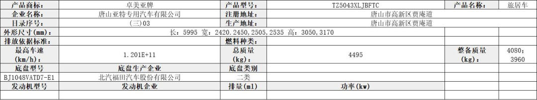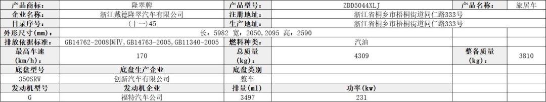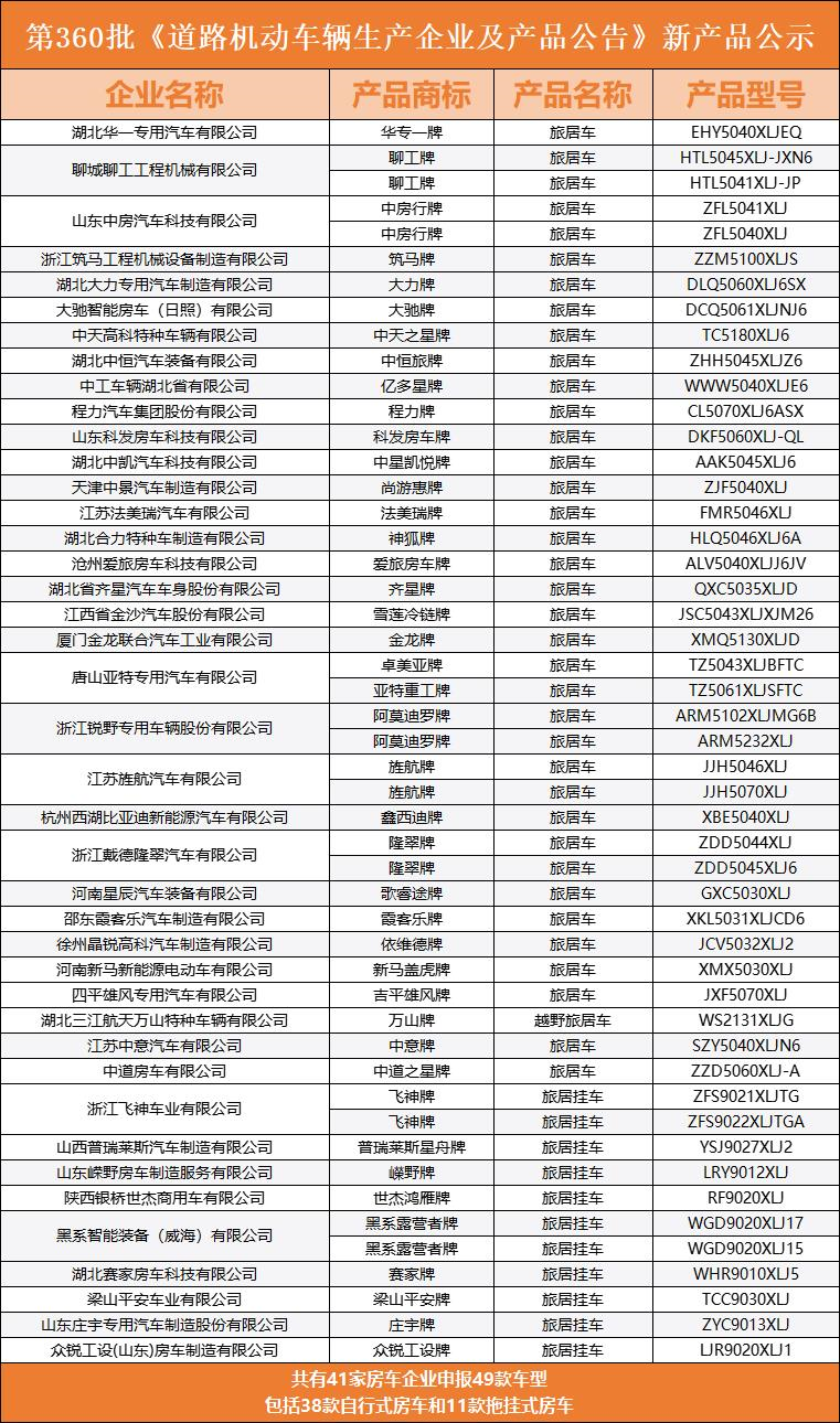2022年8月10日,国家工业和信息化部在官方网站公示了360批关于《道路机动车辆生产企业及产品公告》(以下简称《公告》)新产品,共有41家房车企业申报49款车型,包括38款自行式房车和11款拖挂式房车。此次公告除了之前提到的万山牌越野旅居车型外,隆翠、霞客乐、阿莫迪罗、法美瑞、卓美亚、大驰等知名房车企业都申报了新款车型,其中还有不少特色车型。