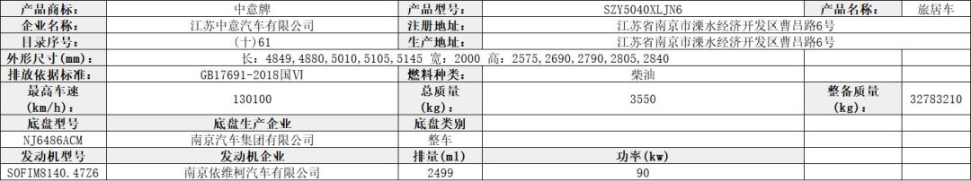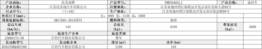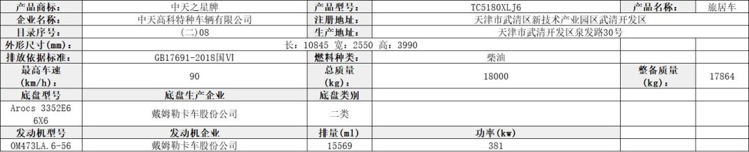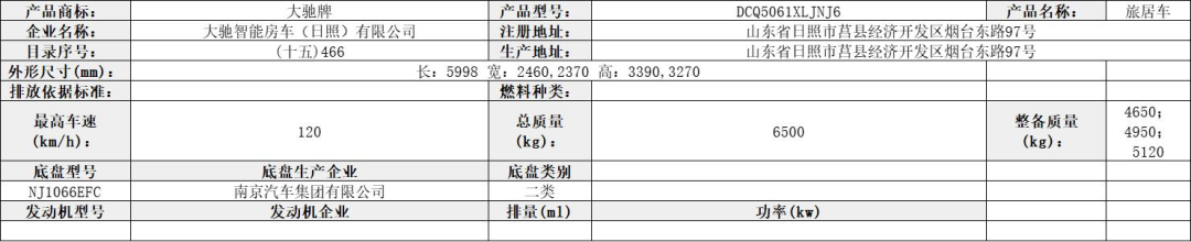 该车设有桌椅,睡具、炊具、卫生设施及必要的照明和空气调节等设施和液晶屏,影音设备等旅居生活娱乐专用装置,用于旅行宿营,该车选装ETC车载装置;该车以裙边结构作为侧、后防护;发动机最大净功率为101kw。