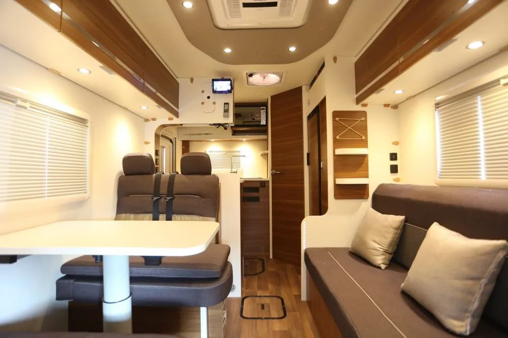 双拓展舱设计,内部生活空间非常宽敞,内饰采用德国进口的菲林格尔板材,欧洲顶级环保标准,为旅行健康保驾护航;乘坐休息空间设有四人位的对坐卡座沙发,同时还配有一个气动升降的小桌子,平时可休息、办公。