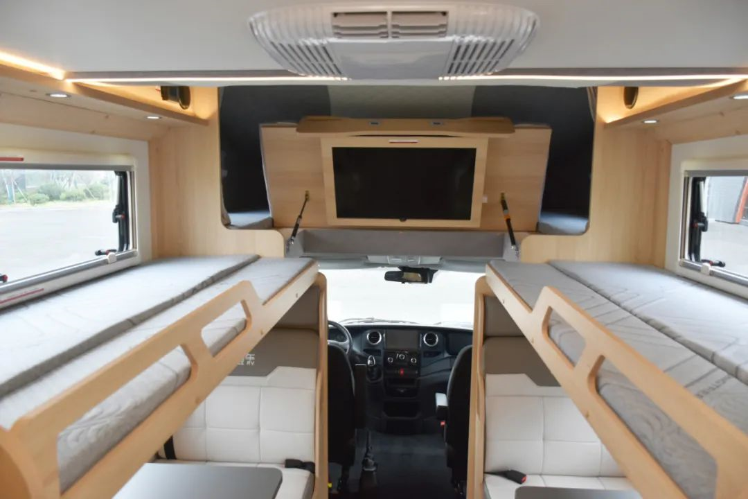 内饰色彩搭配以明亮的浅色为主,车内暖黄色的氛围灯给人温馨明朗的感觉;车内布局整体性更高,十分通透,设置了4张单人床+1张双人床,可满足6人的睡眠要求。