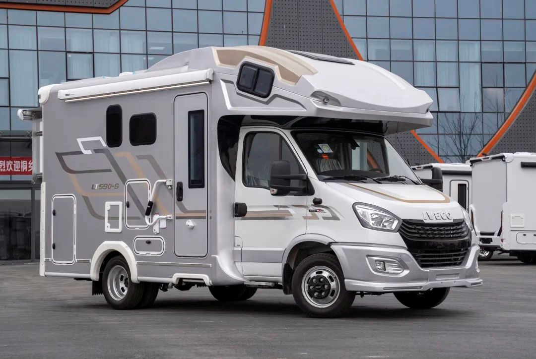 依维柯欧胜房车专用底盘,3.0T+8AT黄金动力配比,换挡平顺,峰值扭矩400N·m,满足国六排放标准,蓝牌C照即可驾驶。整车尺寸5995×2380×3165mm,香槟色的车身+白色的车头搭配金灰色的拉花,额头处深色线条的描边勾勒出整体轮廓,整车外观十分精致而大气。