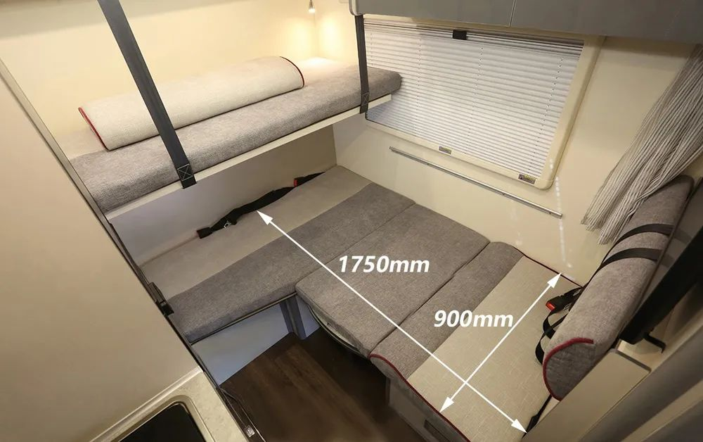 生活区前部设有额头双人床,采用拓展床设计,扩展后尺寸为1700X1950mm;后方对向卡座也可以拼床,可拼成一张1700×900mm的单人床,增加车内休息空间。