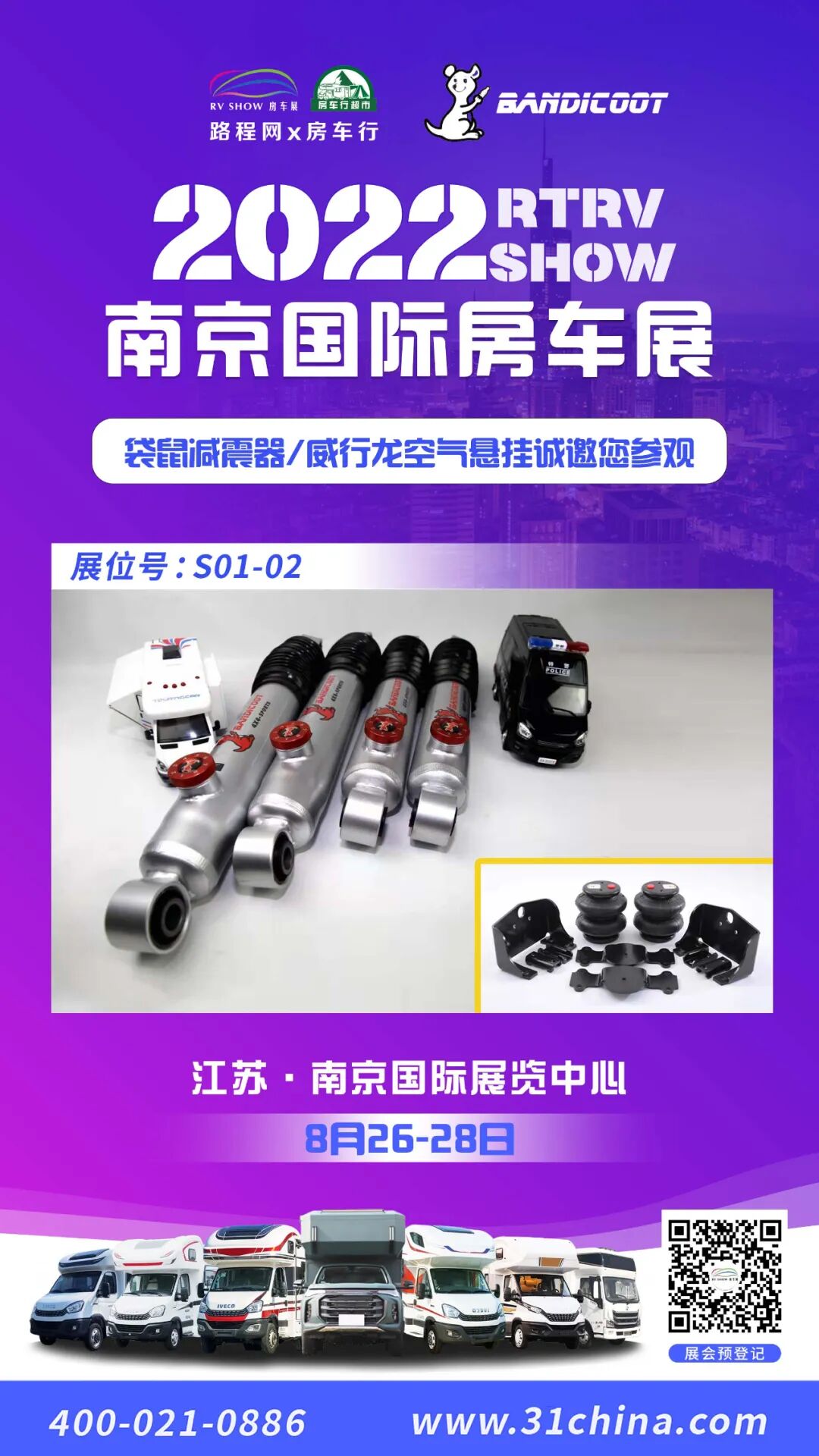 2022 南京国际房车展将于2022年8月26日-28日在江苏·南京国际展览中心举办。除了房车整车外,还有众多房车零配件及房车配套设施参展,本次为大家带来的是袋鼠减震器/威行龙空气悬挂系列产品: