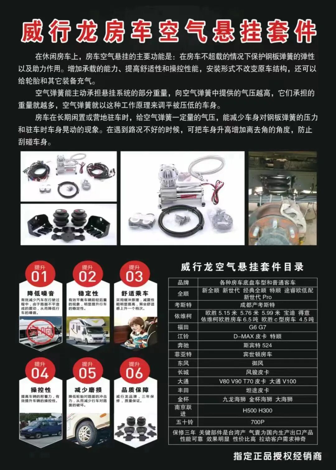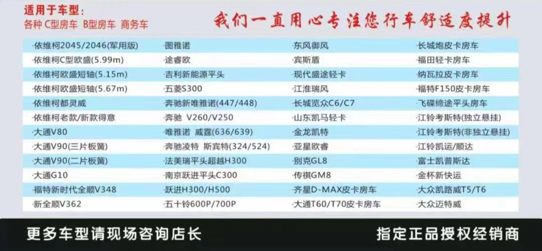 目前,袋鼠系列减震产品已在依维柯系列底盘、大通系列底盘、福特系列底盘、五菱系列底盘、奔驰系列底盘等各种C型房车、B型房车、商务车上广泛应用,并得到大家一致好评。