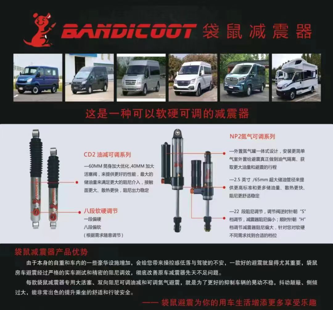 房车旅行,难免遇到崎岖路面,当原车自带的减震设施不足以应对时,车身晃动不稳、侧倾在所难免,自然也无法安心驾驶;这时一款好的避震设施就变的尤为重要,而袋鼠系列性产品就可以完美解决这些问题,无论是轻度替换升级还是深度玩家所需,袋鼠减震系列产品都可以根据不同路况找到相应产品满足玩家的各项所需,人性化推荐,让你的爱车少花钱,也能拥有非凡的减震效果;