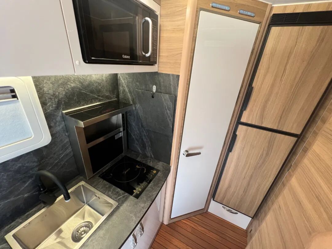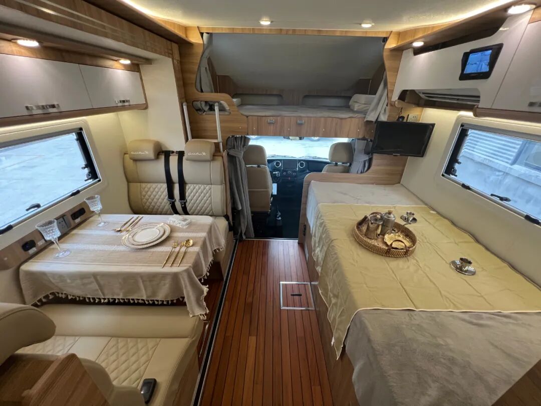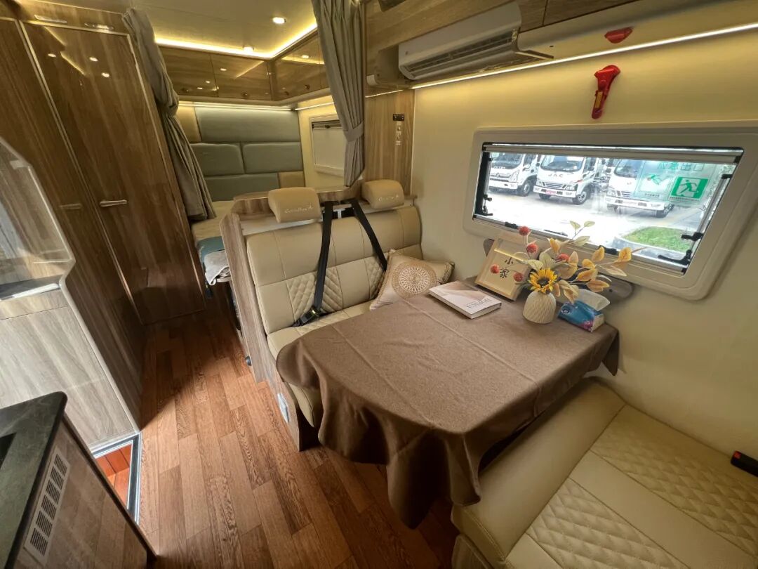 生活区前部设置了额头床、会客厅、沙发床,厨房和卫生间位于尾部,使用更加方便;左侧会客厅对向沙发卡座采用皮质材料,质地柔软,乘坐舒适,驻车后打开拓展机构,可增加过道空间。