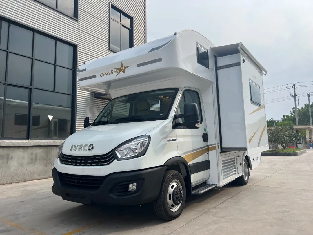 国六依维柯欧胜底盘打造,搭载3.0T涡轮增压柴油发动机,匹配8AT变速箱;大额头造型设计,经典白色车身,车身绘有金色拉花,左侧设有拓展舱;整车外尺寸5995x2455x3060mm,核载6人,上蓝牌,C照即可驾驶。