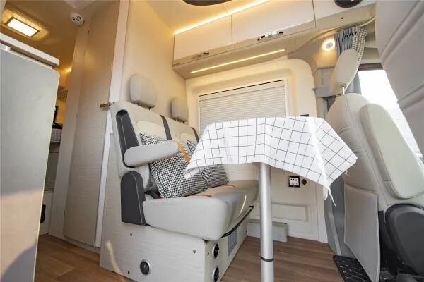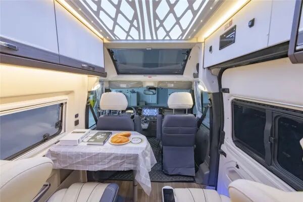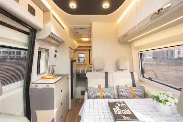 内饰采用进口E0级环保家具板材,搭配进口环保地板革,生活更有品质;布局采用C型房车常见的“额头床+卡座拼床+尾横床”三床布局,睡眠空间宽裕,再加上双拓展舱的设计,整车的生活空间非常宽敞。