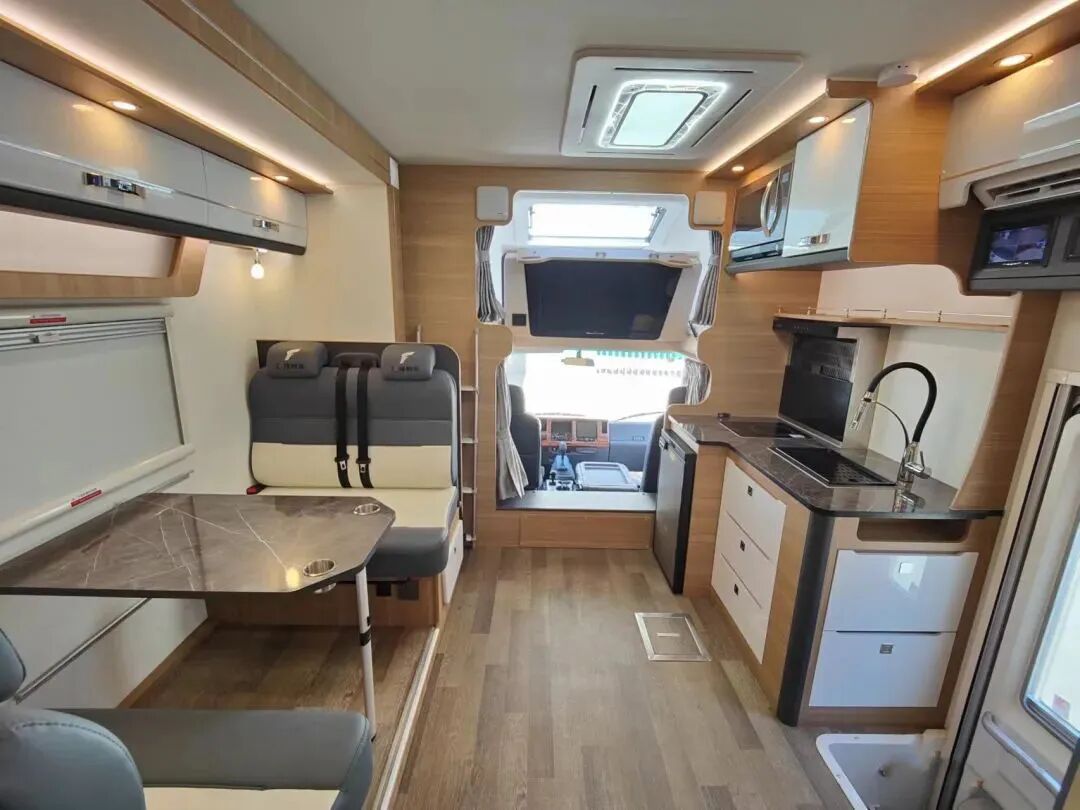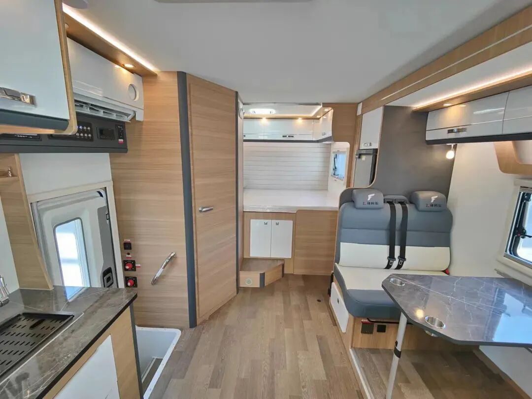 内部生活区是C型房车常见的尾纵床布局,L型布局的沙发卡座,乘坐空间丰富,还可以与可旋转的副驾驶座椅组成更大的休息空间;尾部还有一张固定纵床,旅行休息方便舒适。