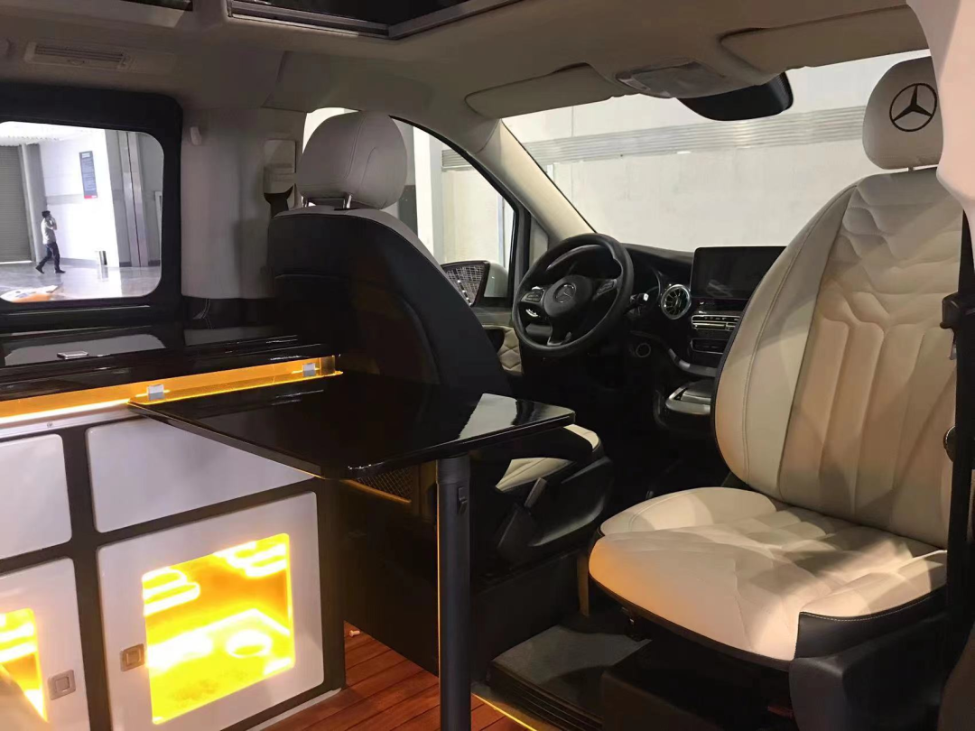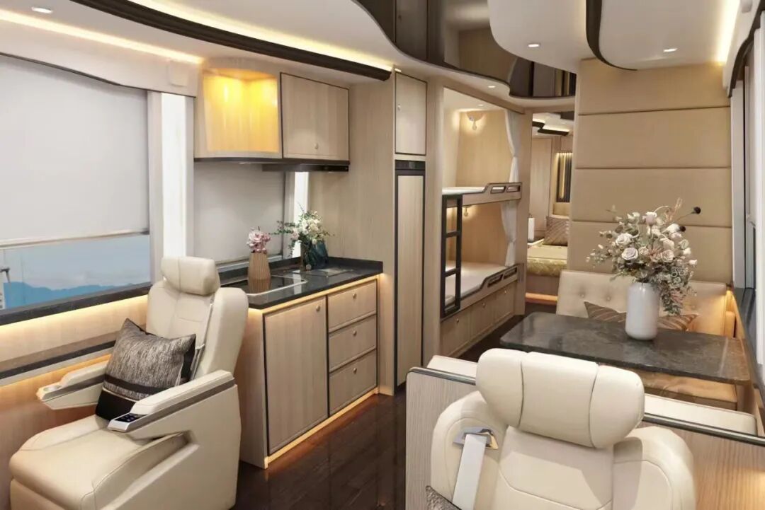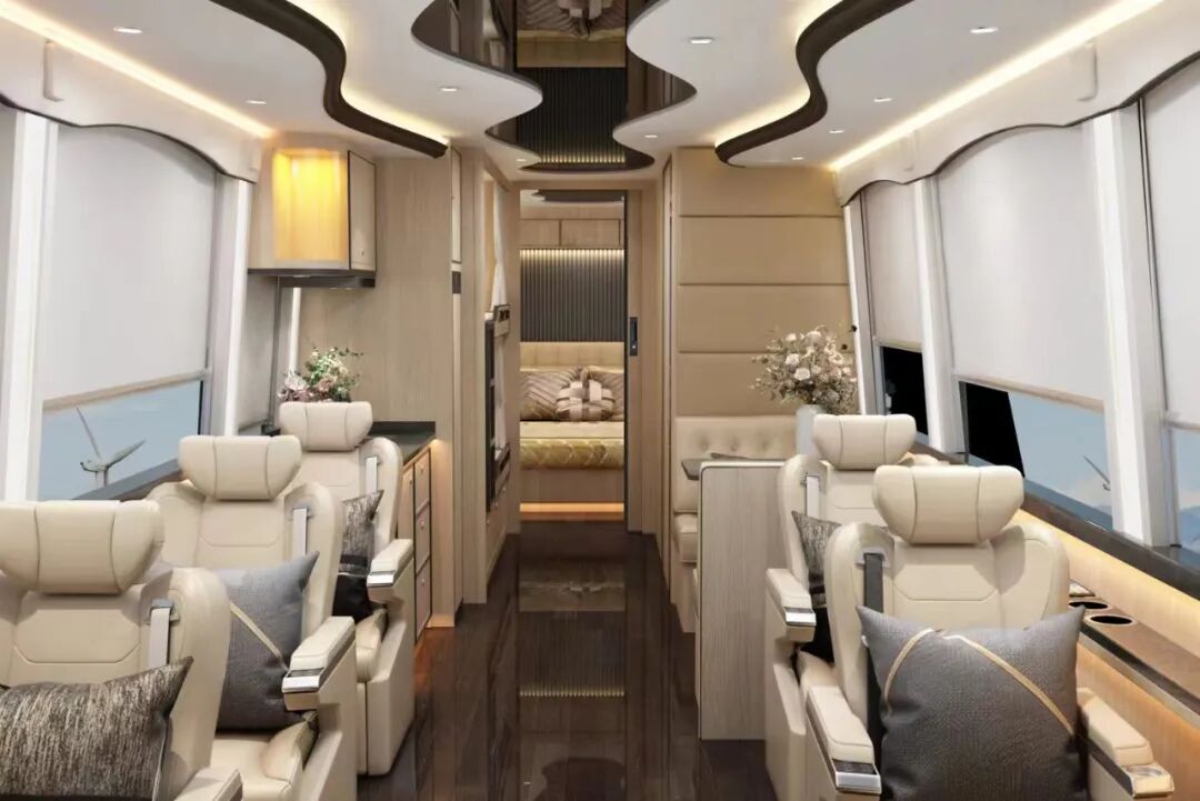 内饰设计大气,细节之处彰显人性化,真皮座椅,配合大理石台面,兼具舒适性和实用性为一体;车内设置了5张独立座椅和对向卡座,后方还有独立卫生间、厨房,尾部还有超大卧室。