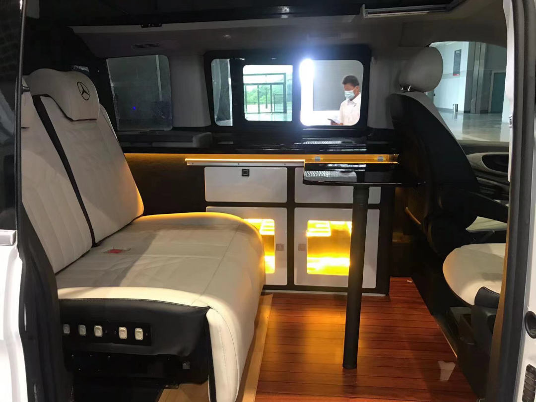 奔驰底盘打造,动力系统搭载2.0T汽油发动机,匹配9速自动变速箱,额定功率155kw,额定扭矩350N·m,动力充沛;黑色炫酷车身,更显尊贵身份,车身外尺寸5370x1928x2050/2120mm,核载4-6人,顶部设有升降床铺,满足蓝牌C照可驾驶的要求。