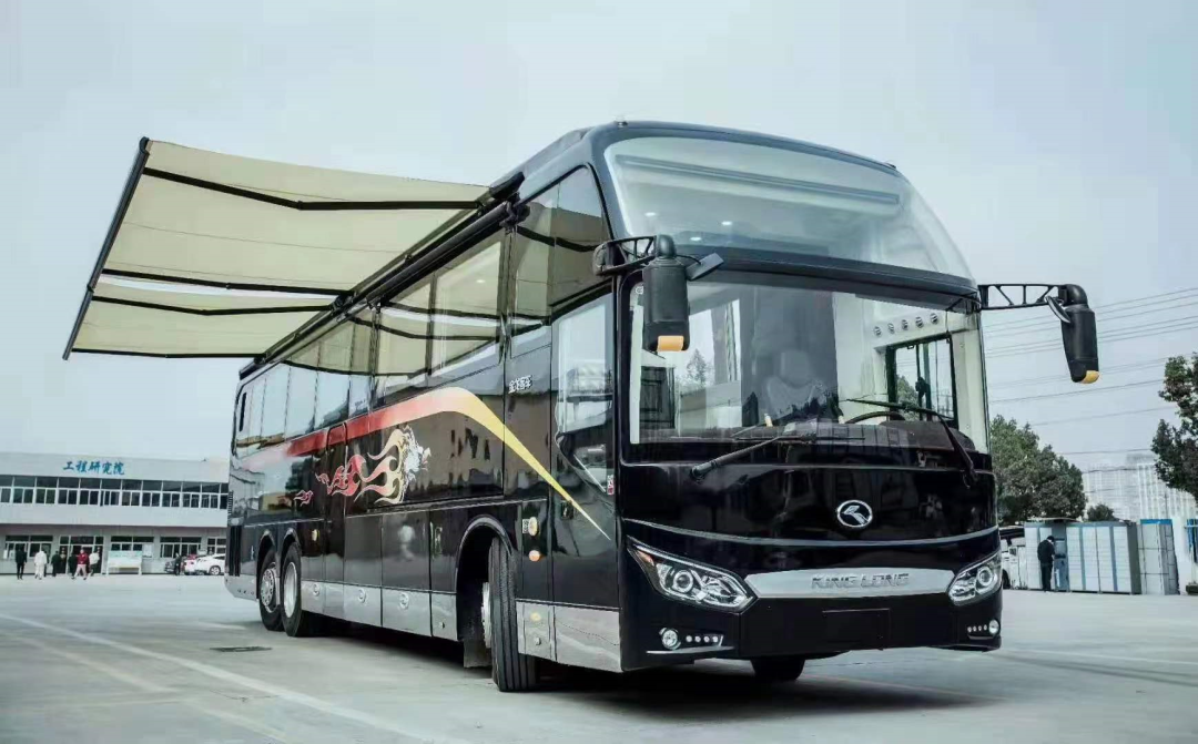 金龙客车底盘打造,车身部尺寸12000x2550x3820mm,核载2-9人,车内空间充足,各项生活设施配备齐全,带来更舒适的旅行体验;整车外观以黑色为底色,配以金红两色渐变拉花装饰,更显时尚大气。