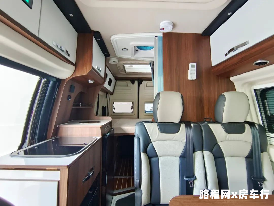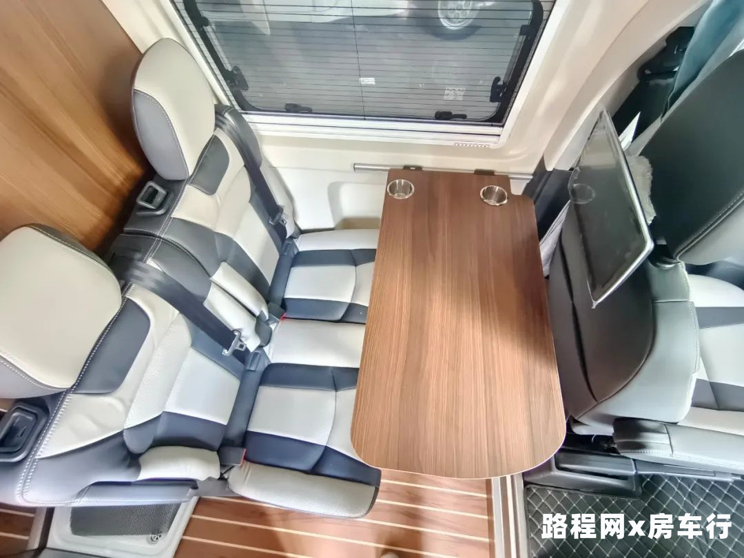 车内生活区设计温馨舒适,搭配暖色照明系统+氛围灯,更有居家的感觉;家具采用板式轻量化板材+进口LG专用地板革,环保耐用;额头休息区设有大空间双人床,尺寸为2000x1300mm,尾部休息区纵置一张2000x1200mm床铺,满足日常睡眠休息所需。