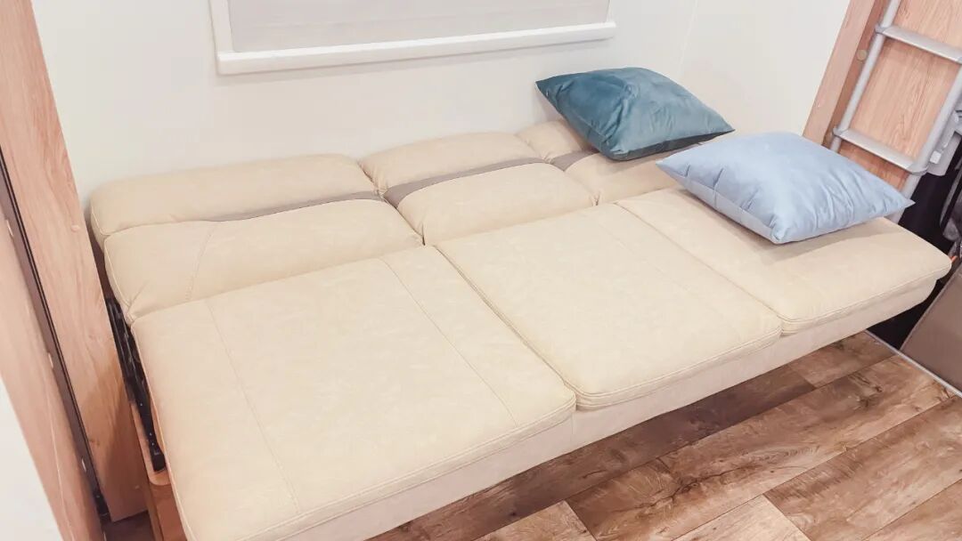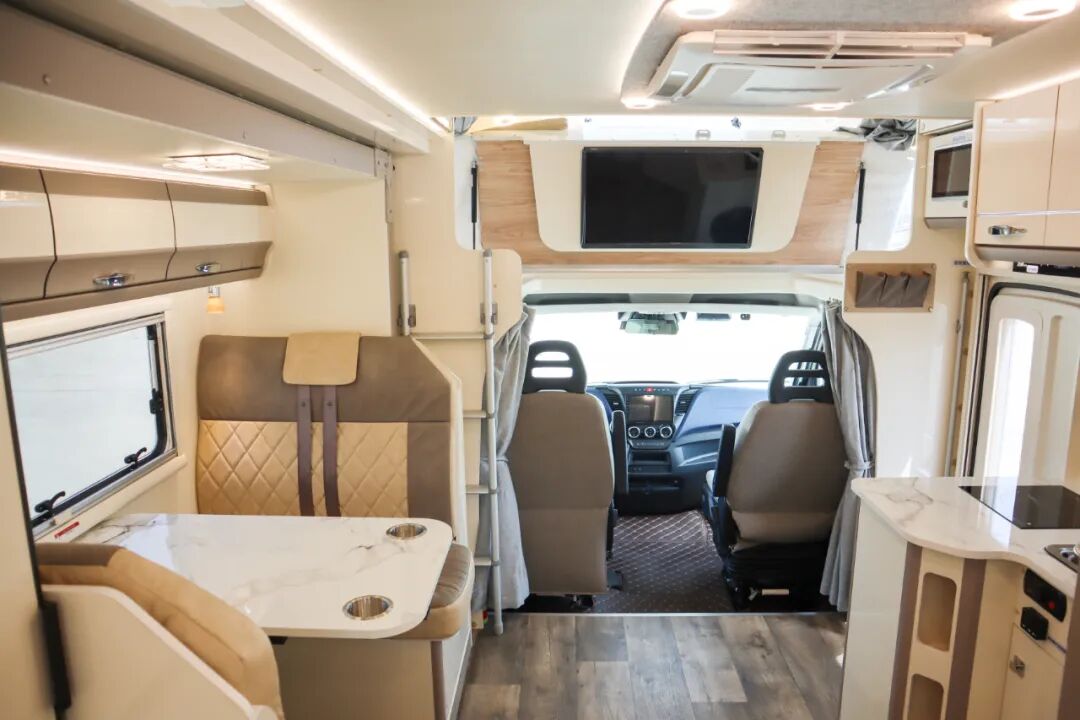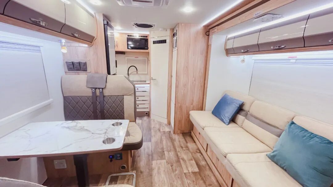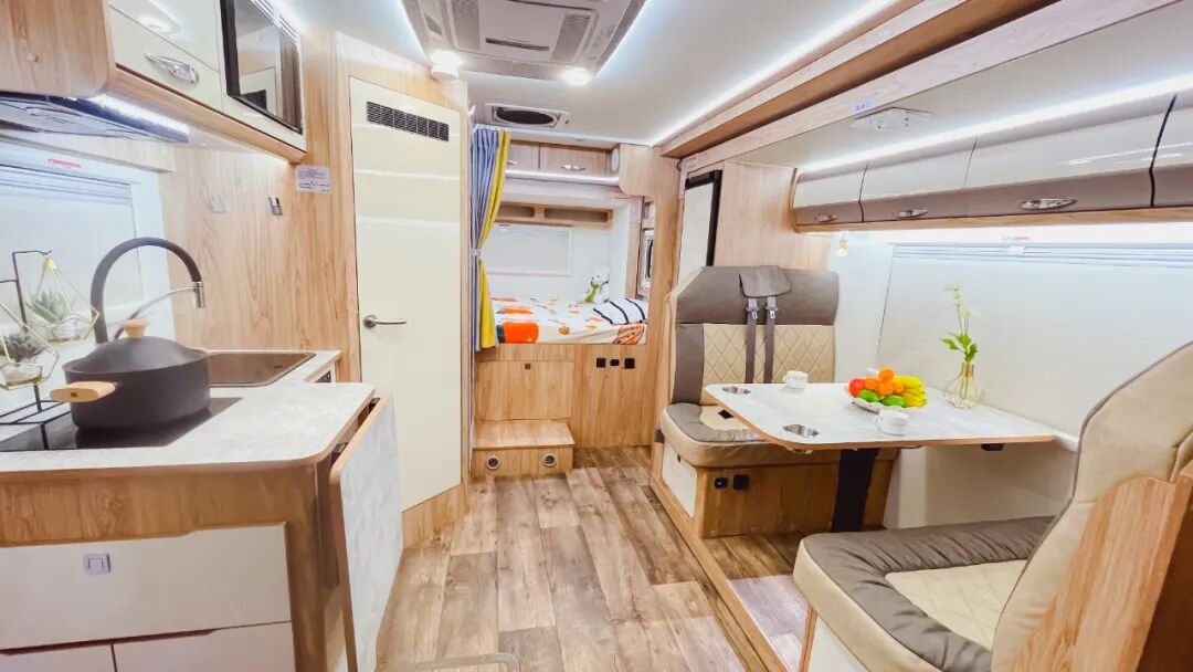 温馨内饰设计,生活设施配备齐全;车身左侧,尾部均设有拓展舱,驻车后可以打开,增加车内空间;休息空间设置了额头床、尾部可拓展横床,前方会客厅也可以拼床,增加车内休息空间。