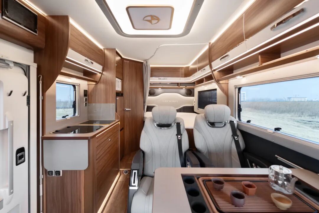 后方生活区配置齐全,会客厅设有双人座椅,中间是可升降餐桌;厨房和独立卫生间,满足日常烹饪、卫浴所需,尾部还有一张大尺寸纵床,满足日常睡眠需求。
