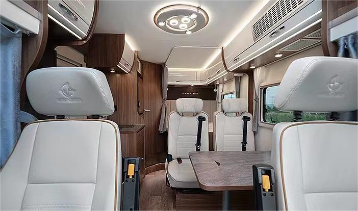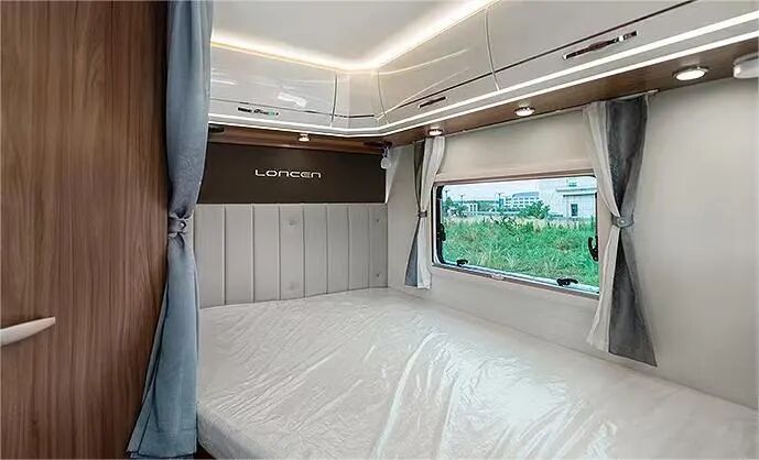 欧式简约风格内饰,采用红木材质,搭配暖色温馨的灯光,打造清新典雅的生活环境;驾驶室上方是一张2.1x1.5m双人床,尾部还有一张可拓展的横床,另外卡座区也可拼床,增加车内休息空间。