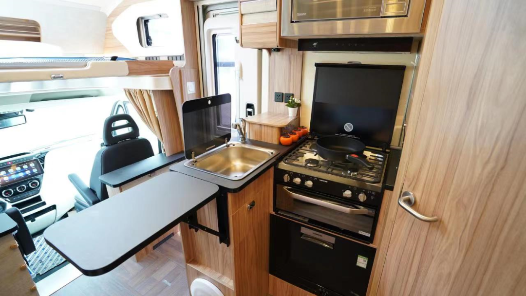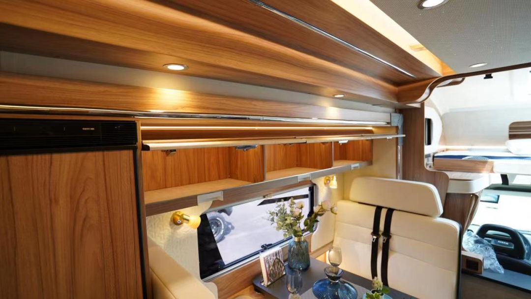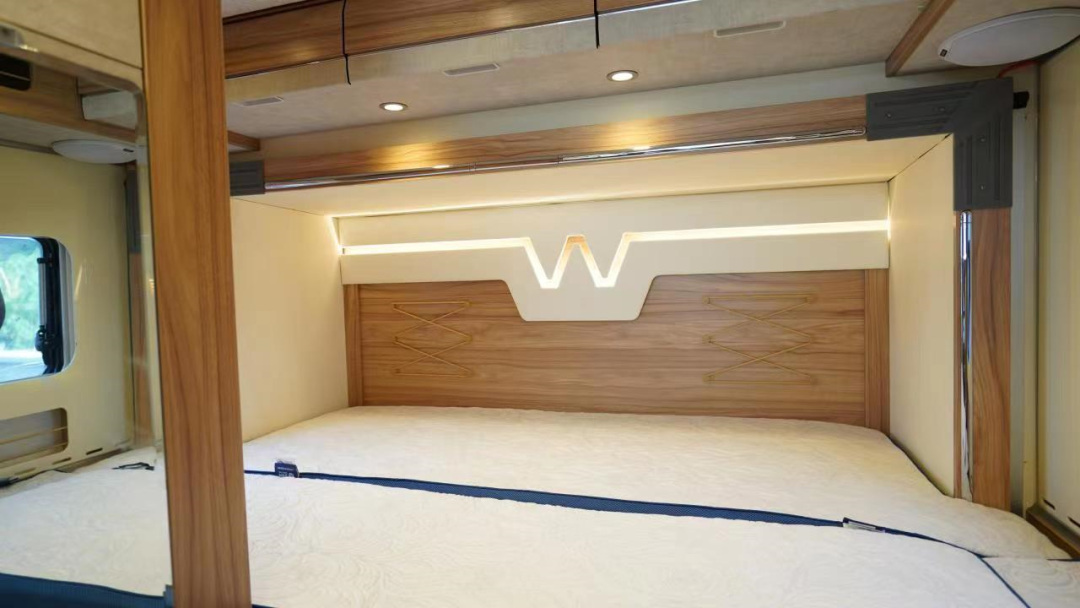 后方生活区是C型房车经典的尾横床布局,设置了“额头床+卡座拼床+尾横床”三张床铺,整体的睡眠空间非常丰富;内饰采用进口菲林格尔环保板材,绿色健康,没有异味,搭配暖色灯光,居住温馨舒适。