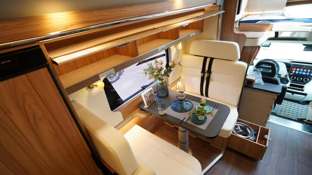 会客区设有对向沙发卡座,可以满足4人乘坐休息,中间配备有电动升降餐桌,休息时也可以拼床;卡座上方设有储物吊柜,方便收纳一些常用的物品。