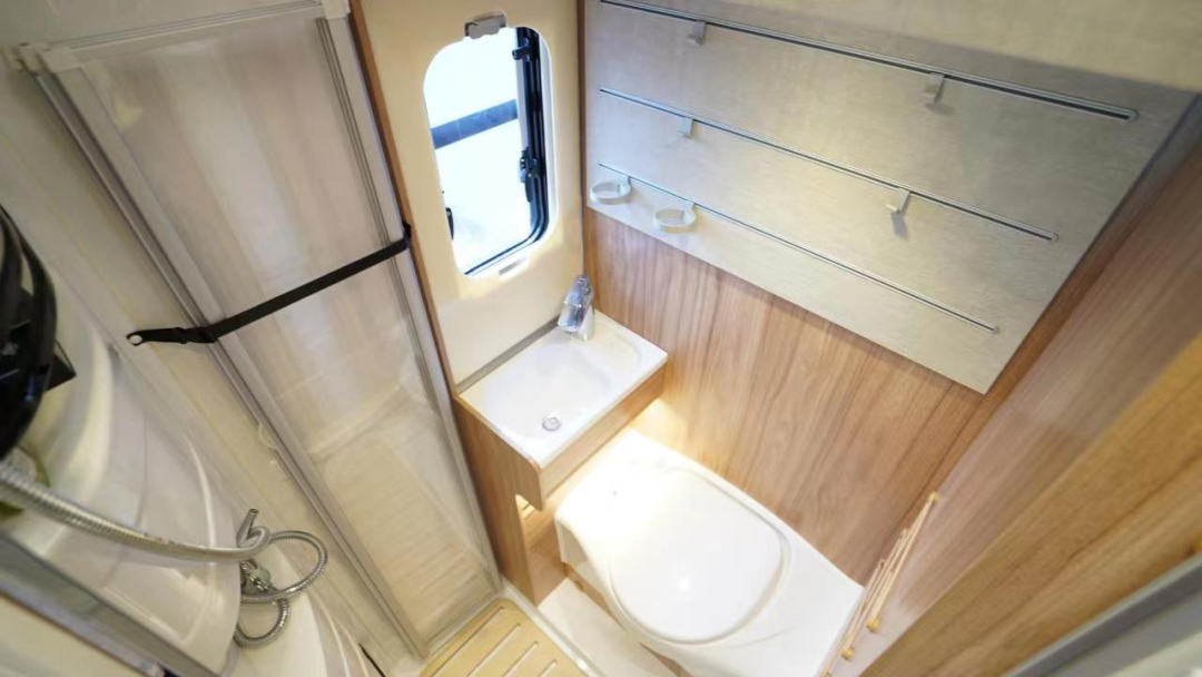 卫浴区采用干湿分离设计,防水、防潮效果更加出色;内部配备了赛德福特盒式马桶、防滑木地板、洗手池、淋浴花洒、迈克斯双向换气扇等。