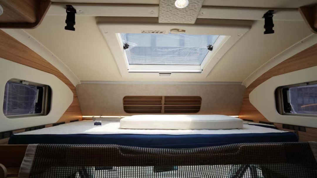 驾驶室上方是额头床,最大尺寸可达2.2x1.5m,空间非常宽敞;顶部设置了超大天窗,满足日常采光通风,两侧还有小尺寸外推窗。