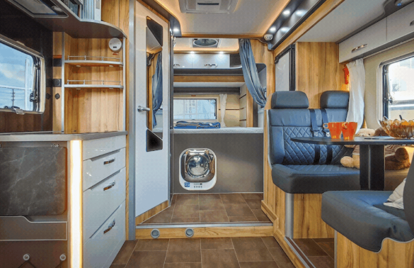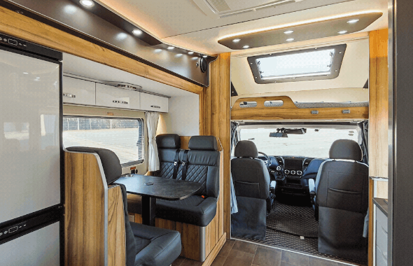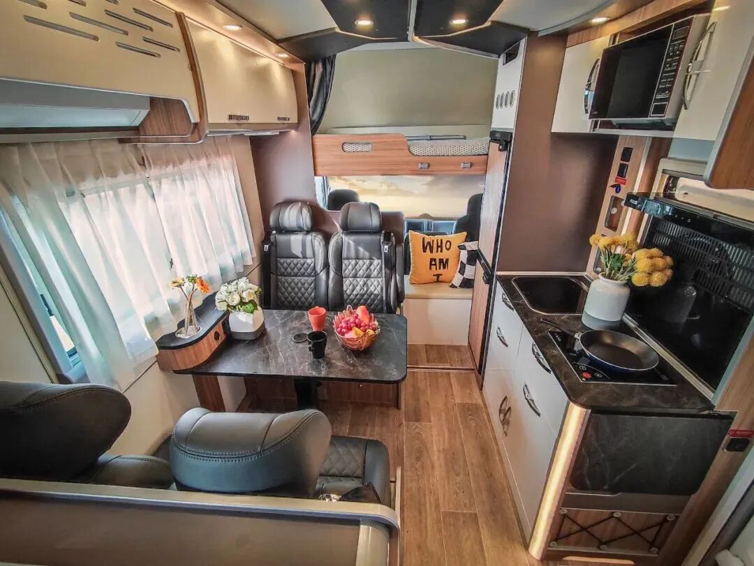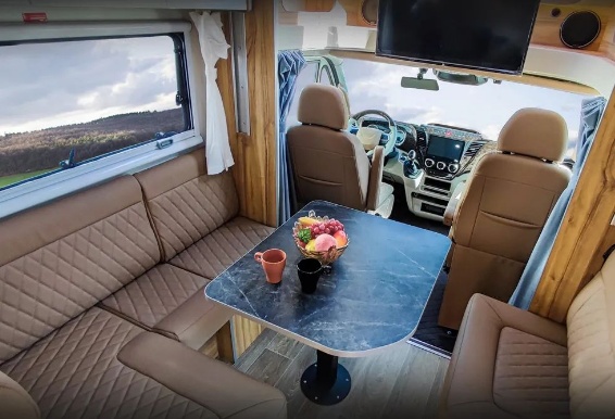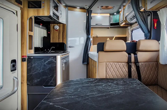 双拓展舱的设计,极大的增加了车内空间;生活区前部设有额头床,尺寸为1200x2100mm,左侧为中置厨房区,右侧为会客区,尾横床拓展后尺寸可达1400x2100mm,可以容纳多人睡眠休息。