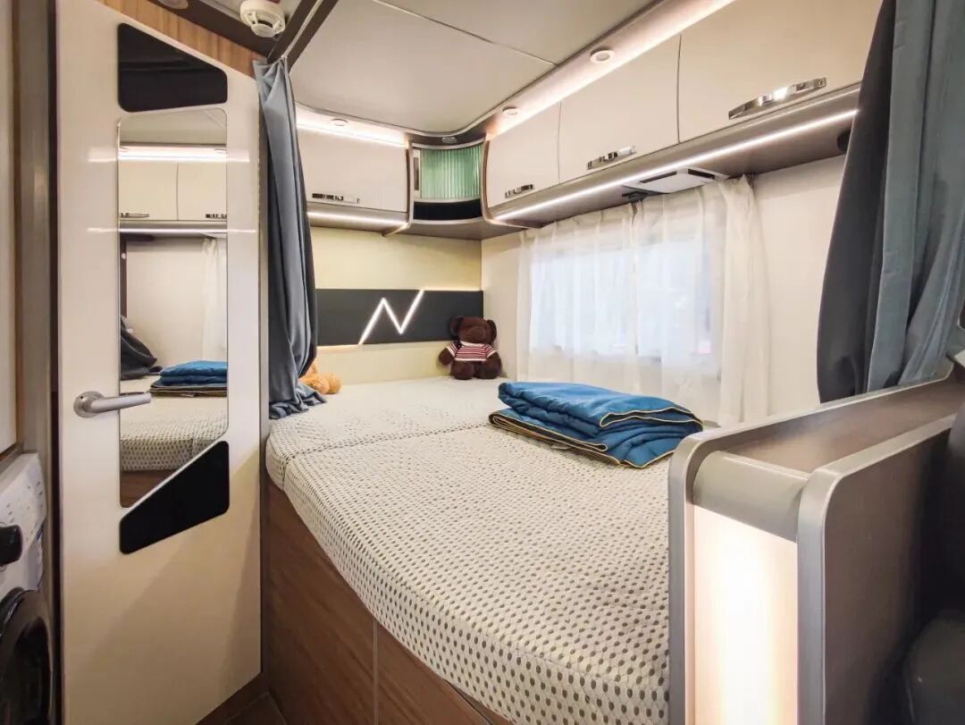 生活区整体空间通透明亮,各个功能区设计合理,内部板材采用E0级环保材料,绿色环保;尾部休息区设置了纵床,尺寸为1200x1880mm,上方还有一张1300x2000mm升降床。