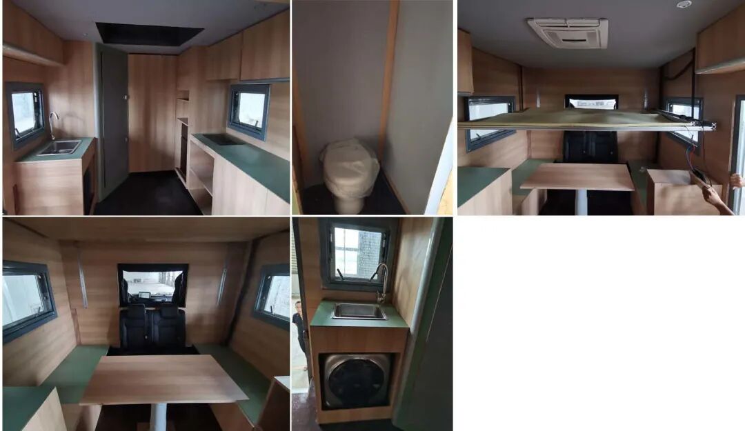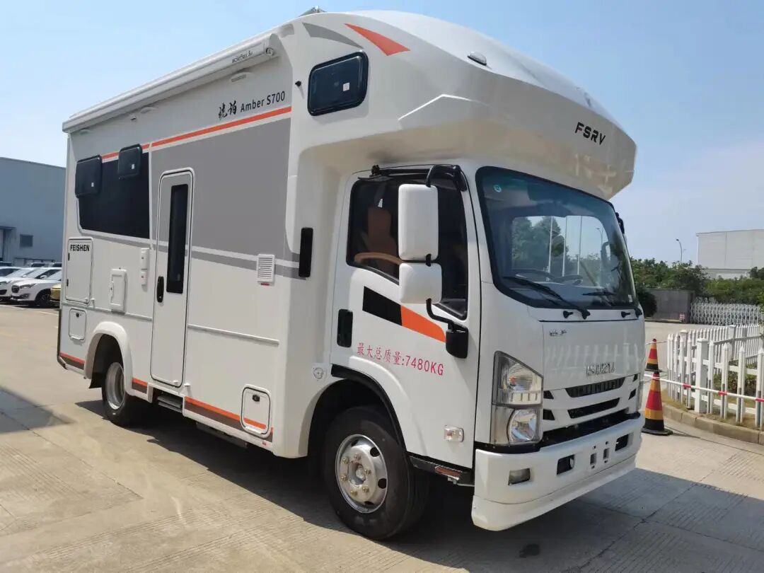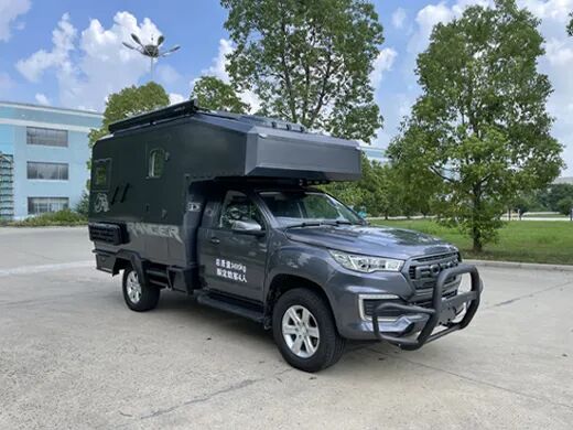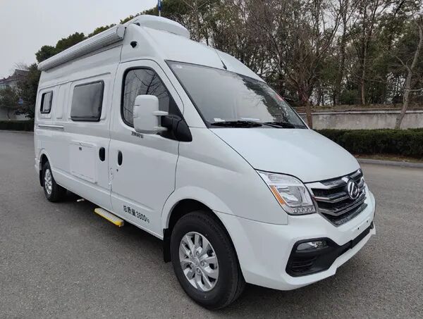 1.车厢顶部封闭,不可开启,侧后部防护为裙边结构,侧防护和后防护离地高度分别为:370mm和370mm;2.配备厨具、睡具、卫生间、液晶屏等旅居生活娱乐专用装置;3.选装遮阳棚时车宽为2415mm,选装遮阳棚和遮雨棚时车宽为2490mm;4.可不选装天窗,可选装后部车窗。