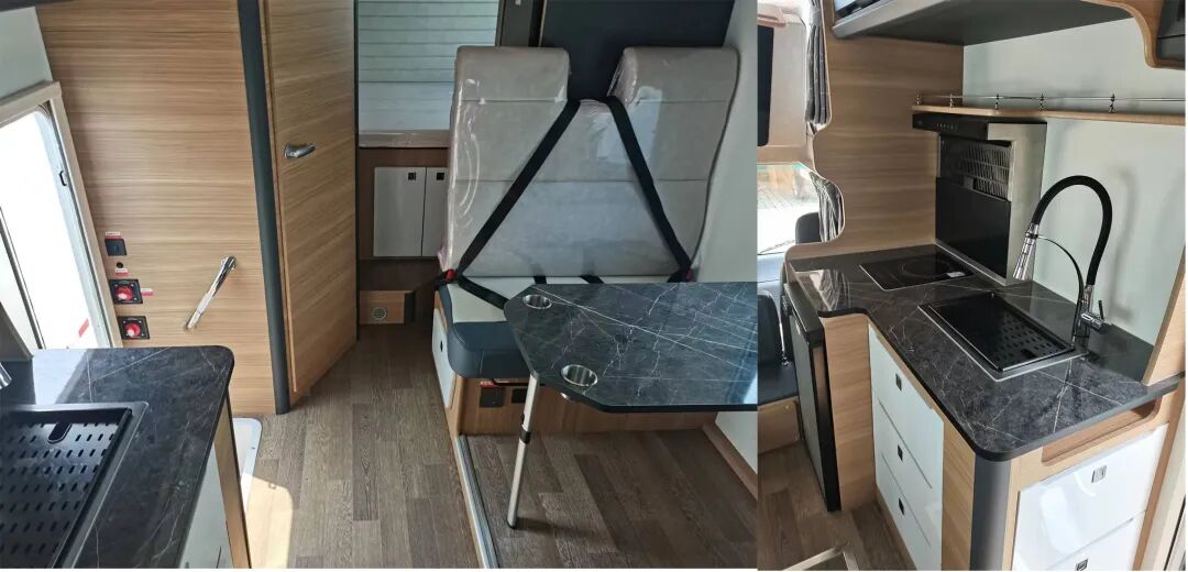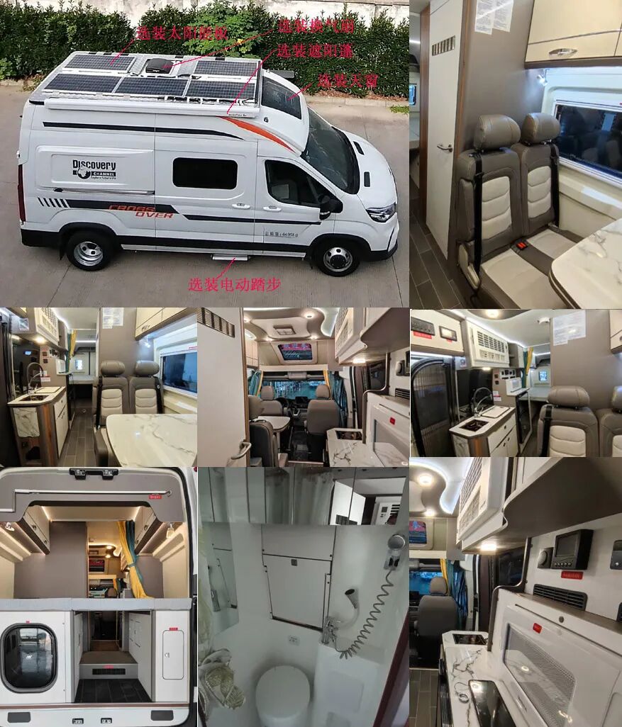 车厢侧面遮阳蓬为选装件,可不装;车顶太阳能电池板为选装件,可不装;该车侧防护和后防护为裙边结构,侧防护下边缘离地高度280mm,后防护下边缘离地高度350mm;该车配备有桌椅、炊事设施、床、卫生设施及必要的照明和空气调节等旅居生活设施,用于旅行宿营。
