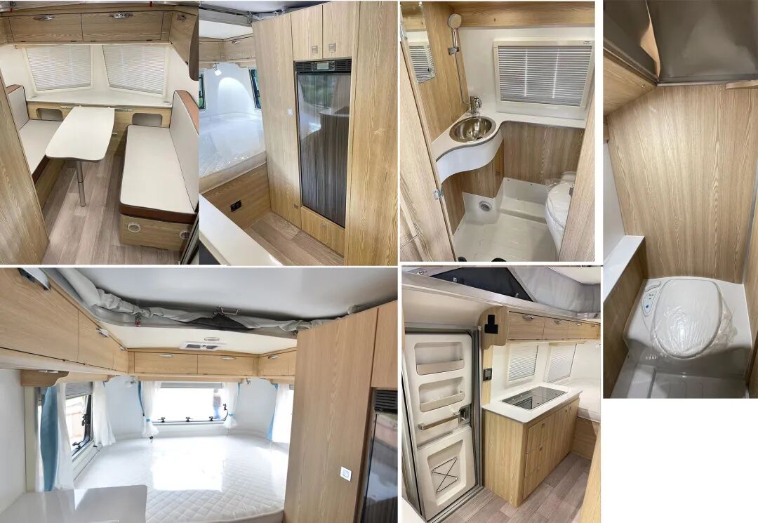 该车非乘用车,行驶过程中不载人;驻车状态车厢顶部可升起使用,行驶过程中不可开启;牵引杆深入量为40mm,连接器最大负荷100kg;厢体内部按旅居卧室布置、床、沙发、卫浴和厨具等,可选装前部自行车架,可选装遮阳棚。