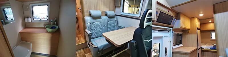 车辆内部配备桌椅、升降床、卫生间、空调等旅居生活设施,用于旅居宿营;车头顶部灯具仅限人员在野外非道路状况下工作和生活照明使用;EBS型号:EBS 5;EBS生产企业:东科克诺尔商用车制动系统(十堰)有限公司;仅采用3650轴距(mm)。