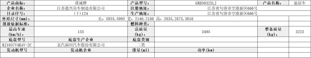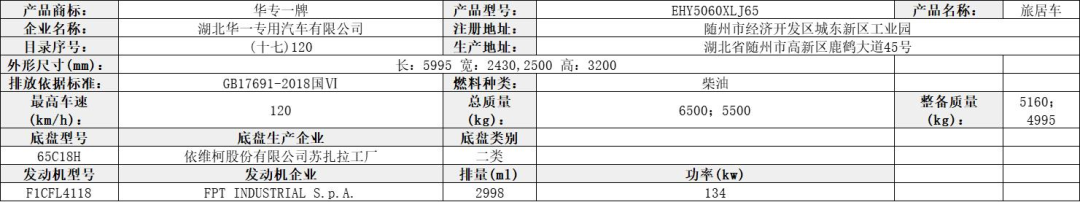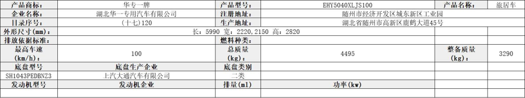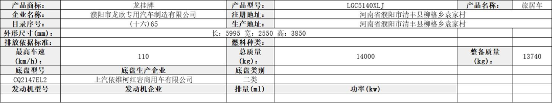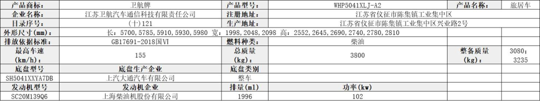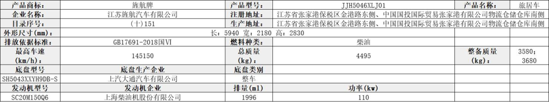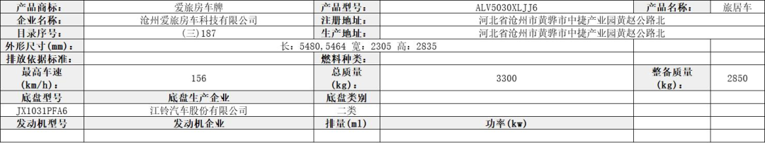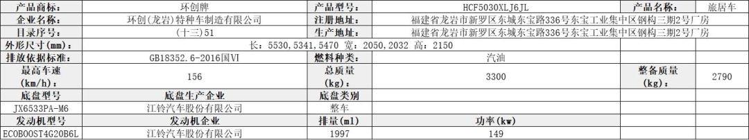 该车装配睡具、炊具、卫生设施等设备,用于旅行宿营;ABS系统控制器型号:EV5051,生产企业:博世汽车部件(苏州)有限公司;发动机最大净功率为147KW;选装直接供电式ETC车载装置,整车长度/后悬对应关系(mm):5480/1166,5464/1150。