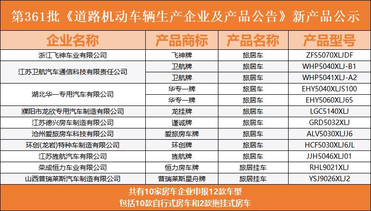 2022年8月25日,国家工业和信息化部在官方网站公示了361批关于《道路机动车辆生产企业及产品公告》(以下简称《公告》)新产品。作为新一批增发的《公告》,该批次公告车型数量仍比正常发布的《公告》少上许多,共有10家房车企业申报12款车型,包括10款自行式房车和2款拖挂式房车,其中卫航房车、旌航房车等知名房车厂家发布了新款车型。