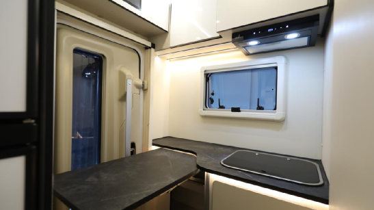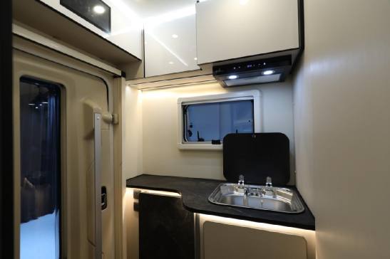 车厢尾部是车内厨卫所在的位置,进门处是厨房操作区域,厨房下方还提供了一个拓展板,增加操作台的面积,厨房提供了抽油烟机、洗菜池、房车专用冰箱。