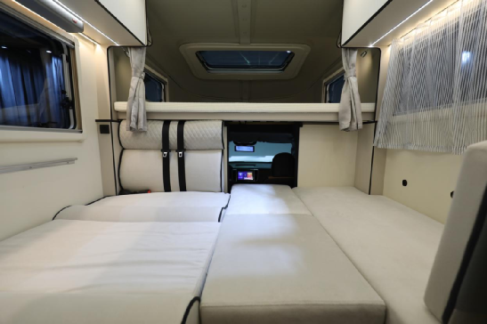 第二张床就是对卡座+条形沙发拼成的沙发床,尺寸达到了1.9mx1.4m。大空间的实用感受,也是完全符合其产品定位,更亲近家庭的旗舰布局,6人旅居皮卡房车。