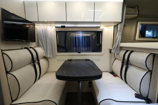 会客区采用的对卡座+条形沙发的布局,四人对卡座在行车时可以乘坐,条形沙发则仅在驻车以后使用,驻车以后对卡座及条形沙发完全可以满足4-6人休憩。