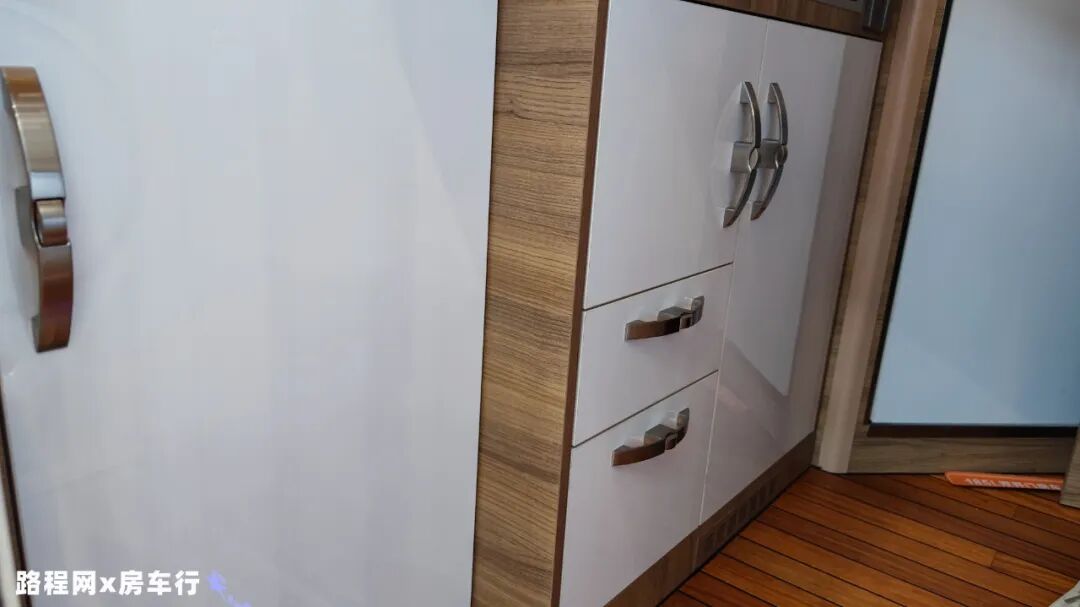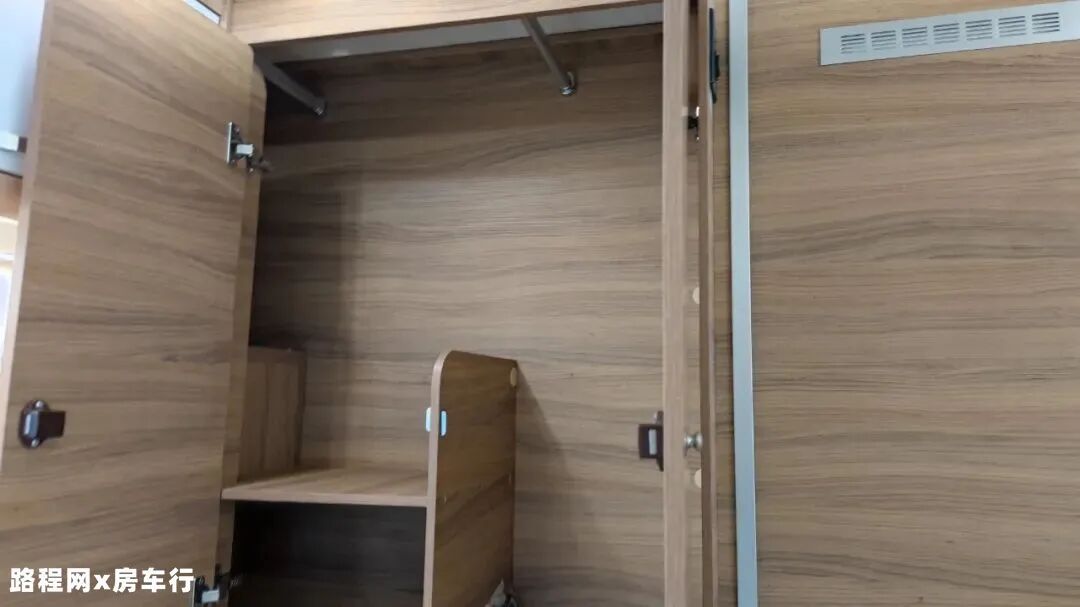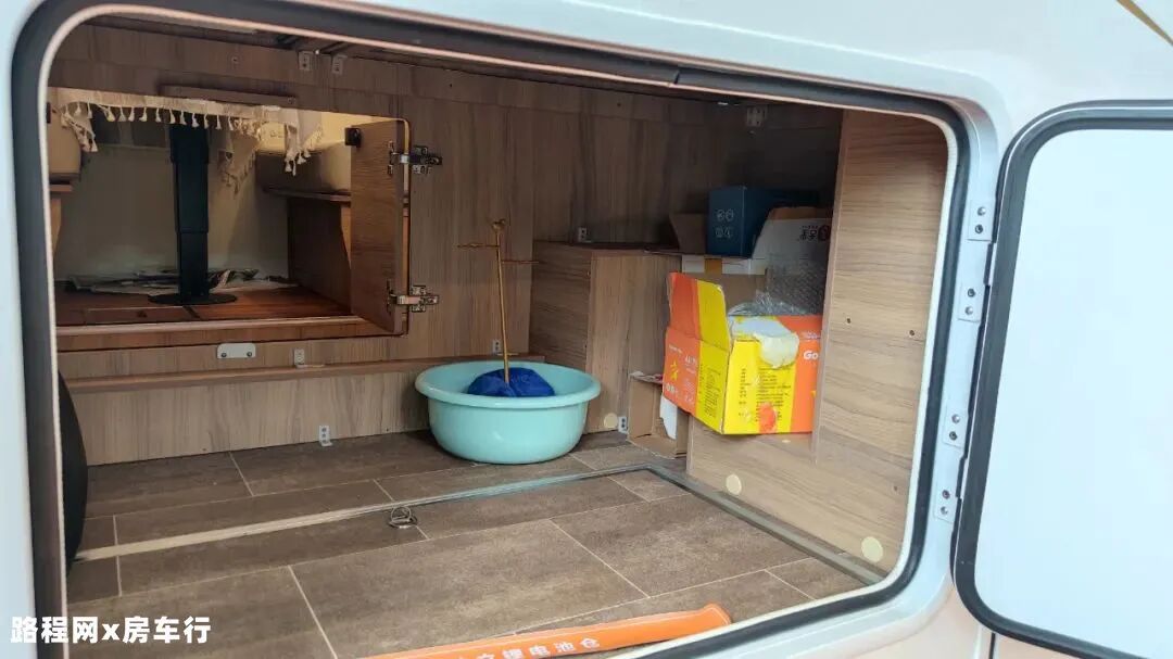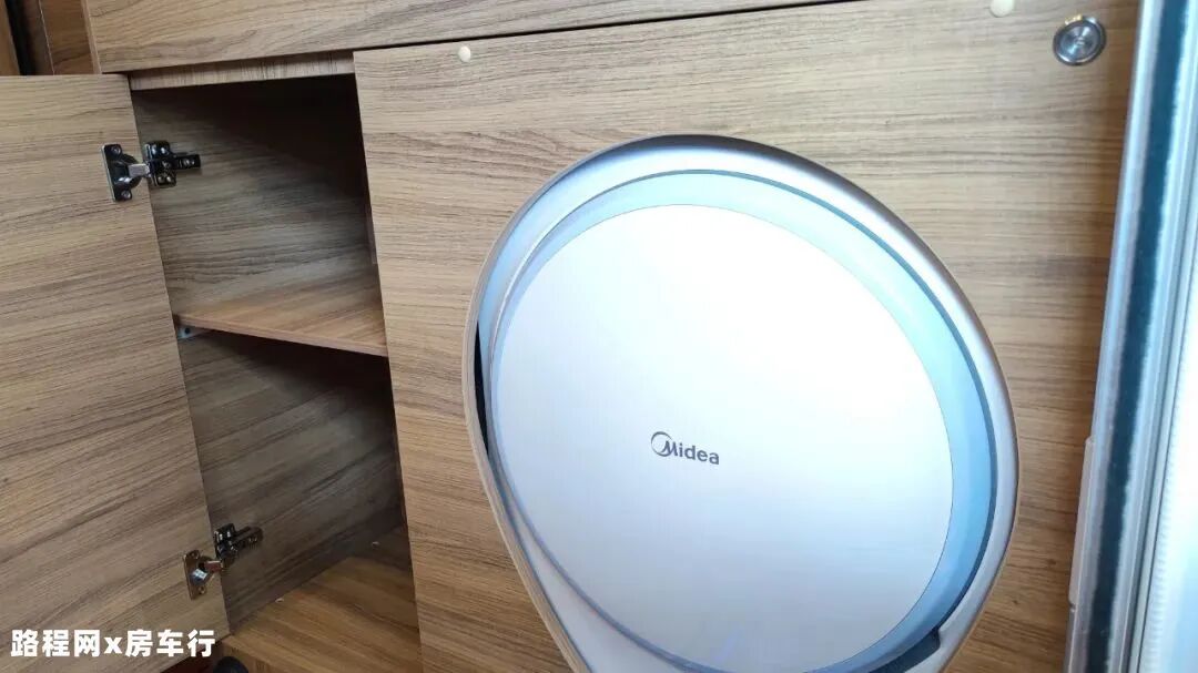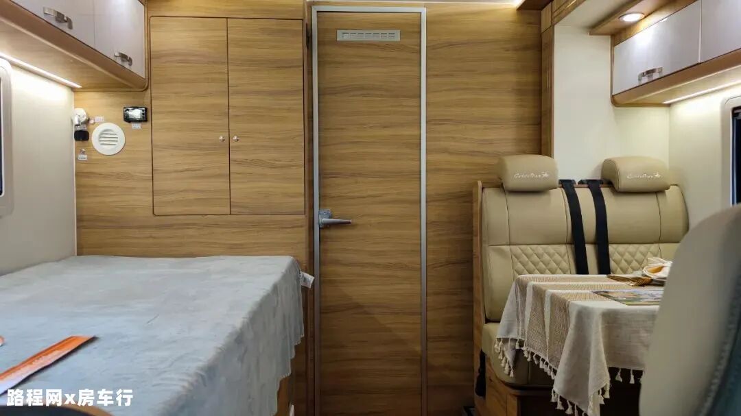 从尾部乘客门进入车内,可以看到生活空间采用独特的尾置厨卫设计,将厨卫和前方生活空间分割开来,中间还设置了隔断门,烹饪时再也不用担心油烟问题;乘客门右侧设有鞋柜,内嵌有一台3KG滚筒洗衣机,轻松解决户外旅行洗衣问题,侧面还有储物柜,增加车内储物空间。