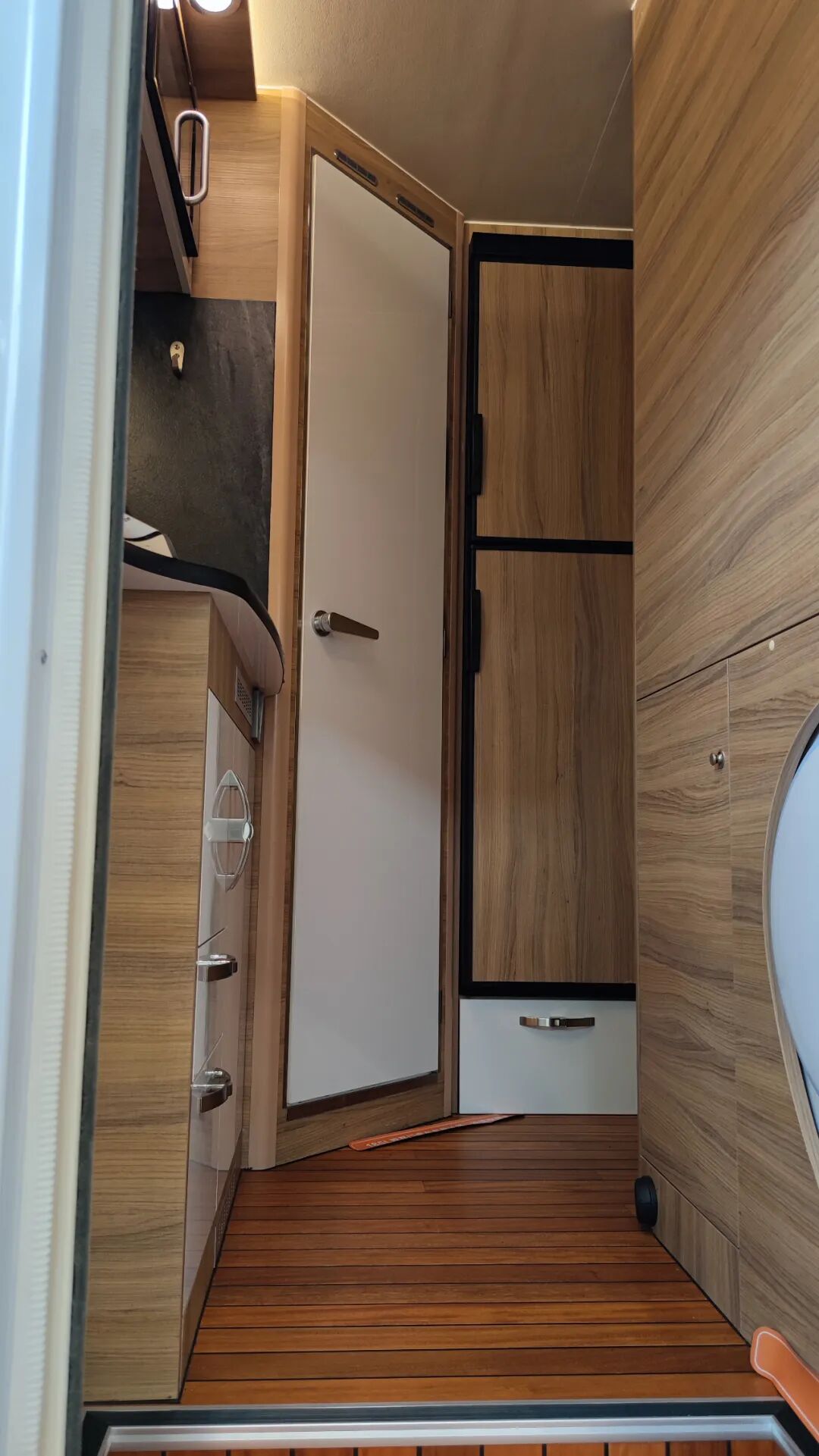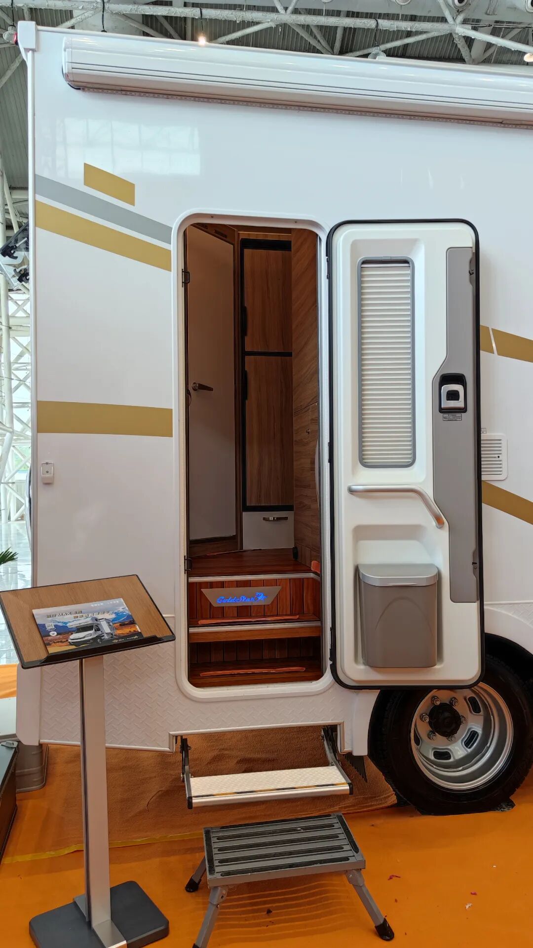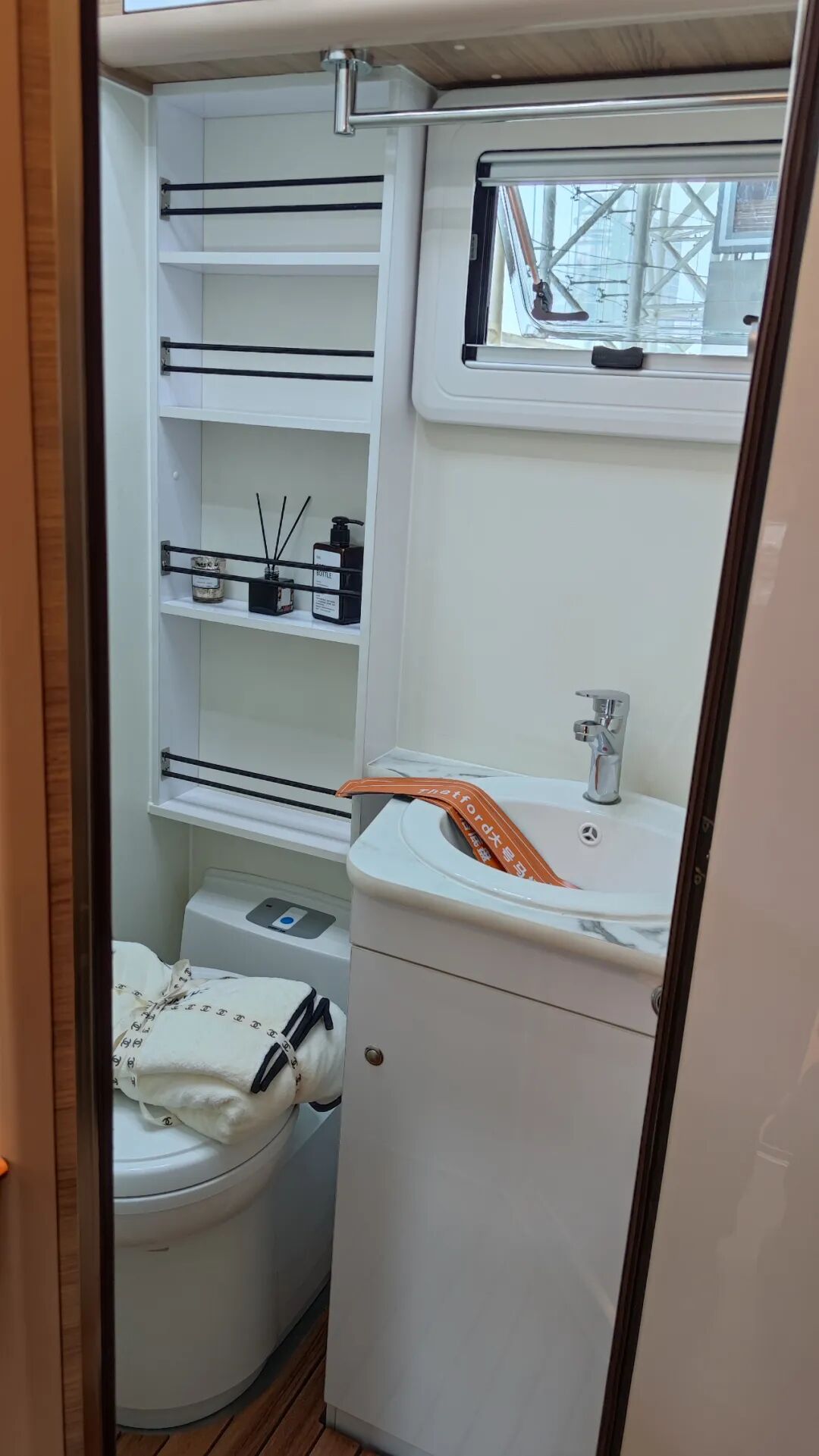 从尾部乘客门进入车内,可以看到生活空间采用独特的尾置厨卫设计,将厨卫和前方生活空间分割开来,中间还设置了隔断门,烹饪时再也不用担心油烟问题;乘客门右侧设有鞋柜,内嵌有一台3KG滚筒洗衣机,轻松解决户外旅行洗衣问题,侧面还有储物柜,增加车内储物空间。